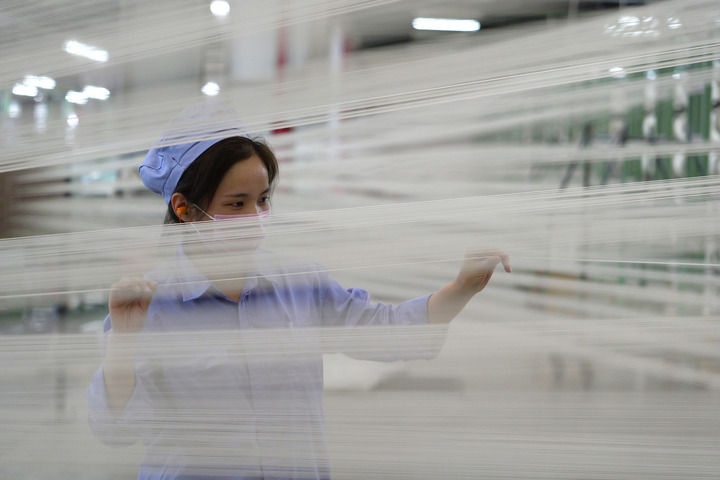 工作人員在位于河南省平頂山市的中國平煤神馬集團(tuán)簾子布發(fā)展公司布機(jī)車間檢查絲線情況(2024年3月28日攝)。中國平煤神馬集團(tuán)積極延伸煤炭產(chǎn)業(yè)鏈,普通的煤炭被加工成眾多高附加值衍生產(chǎn)品。新華社記者李嘉南攝