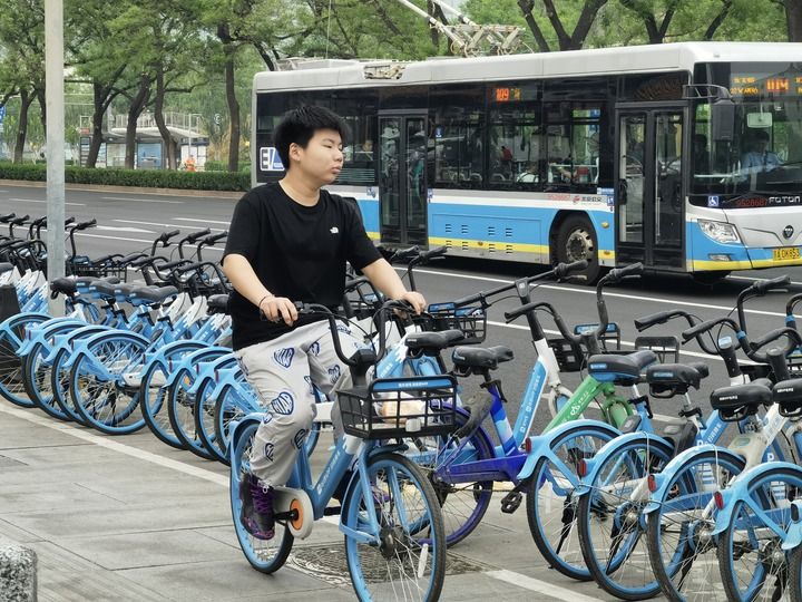 北京街頭,一名年輕人使用共享單車出行(2024年4月22日攝)。新華社記者洪澤華攝