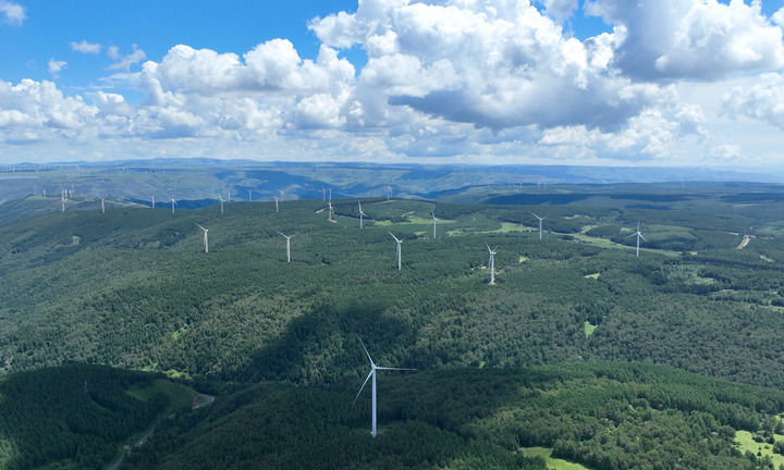 這是河北省圍場滿族蒙古族自治縣御道口鎮(zhèn)附近的風(fēng)電場(2024年7月26日攝,無人機(jī)照片)。新華社發(fā)(梁子棟攝)