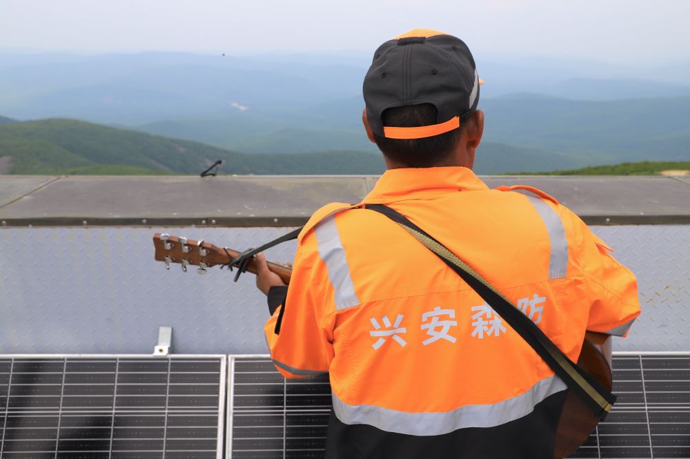 大興安嶺集團(tuán)呼中林業(yè)局瞭望員柯明偉一邊眺望蒼翠的大興安嶺,一邊彈唱(2024年7月30日攝)。新華社記者徐凱鑫攝