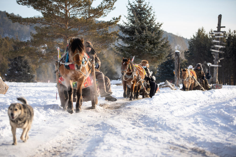 在黑龍江省漠河市北極村,游客乘坐馬拉爬犁(2023年1月10日攝)。新華社記者張濤攝