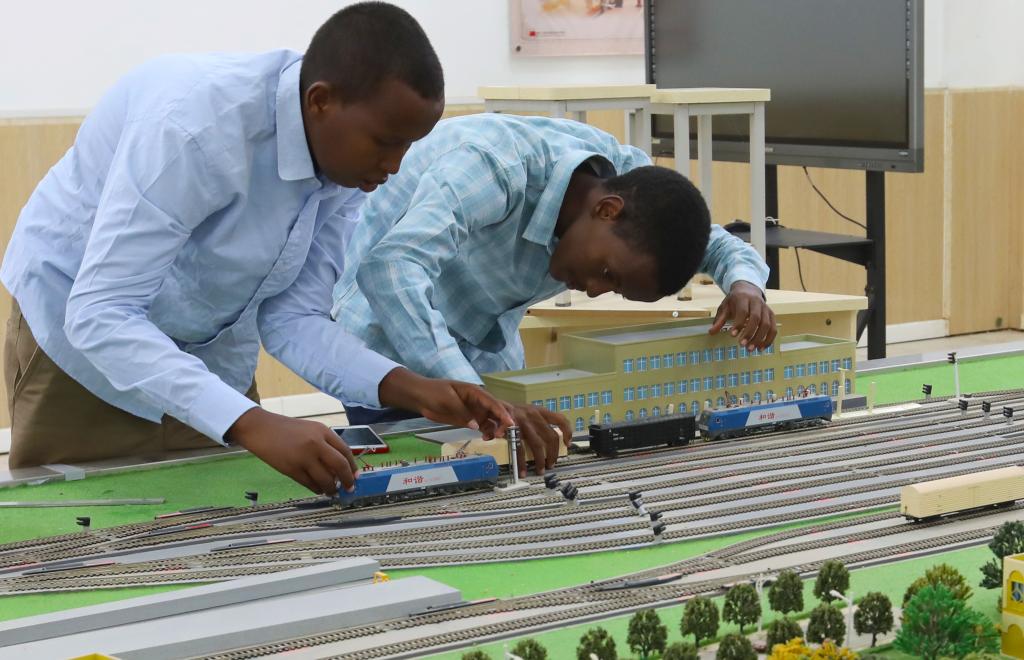 2022年9月19日,在位于吉布提首都吉布提市的吉布提工商學(xué)校,學(xué)生在魯班工坊鐵道運營沙盤教學(xué)區(qū)學(xué)習(xí)。新華社記者董江輝攝