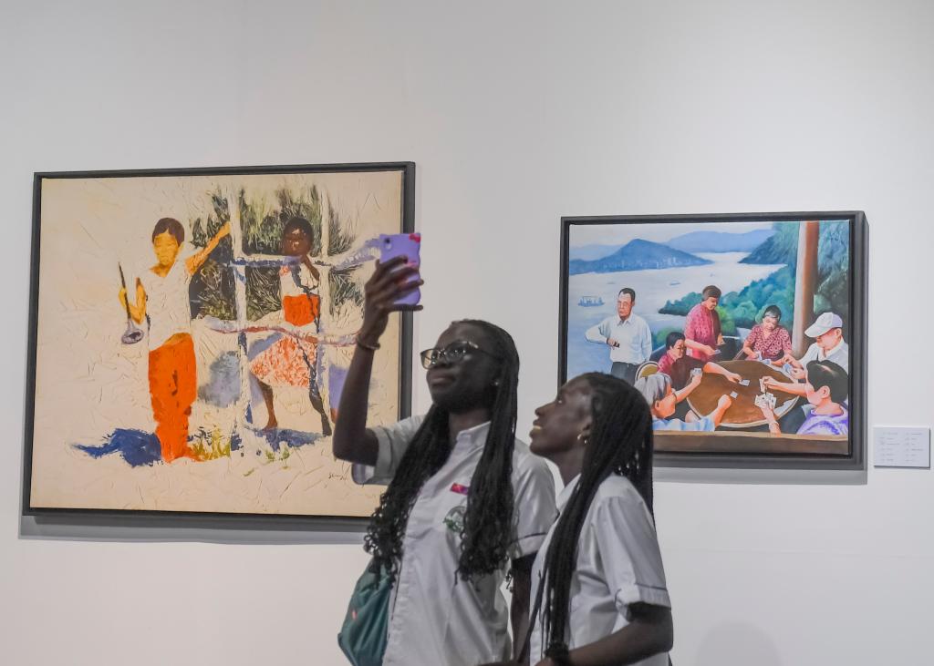 2023年5月12日,游客在塞內(nèi)加爾首都達喀爾的黑人文明博物館與展出畫作合影?!案粞笙嗫础侵蕻嫾夜P下的中國”畫展5月12日在這里開幕。新華社記者李亞輝攝