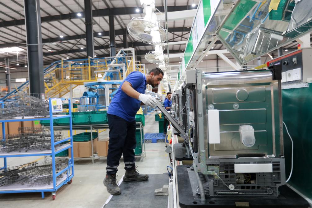 2023年8月10日,在埃及蘇伊士省的中?!ぬ┻_蘇伊士經(jīng)貿(mào)合作區(qū),員工在工廠生產(chǎn)線上工作。新華社記者隋先凱攝