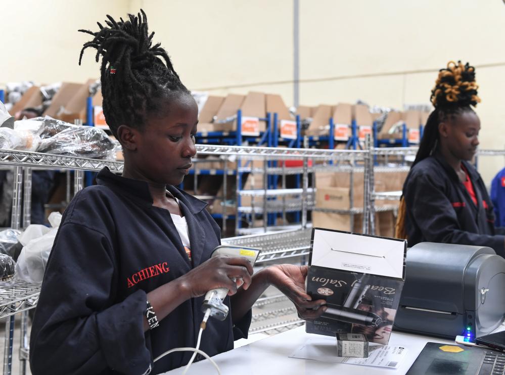 2023年11月10日,在肯尼亞姆洛隆戈,Kilimall員工在倉庫內(nèi)工作。Kilimall是第一家在非洲設(shè)立海外倉并實現(xiàn)100%在線支付的中國電商平臺,是當?shù)孛癖娤矏鄣馁徫锞W(wǎng)站之一。新華社記者李亞輝攝