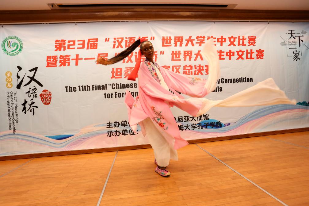 2024年5月22日,在坦桑尼亞達累斯薩拉姆,參賽者在“漢語橋”世界大學(xué)生中文比賽坦桑尼亞賽區(qū)決賽上展示才藝。新華社發(fā)(赫爾曼·埃馬紐埃爾攝)