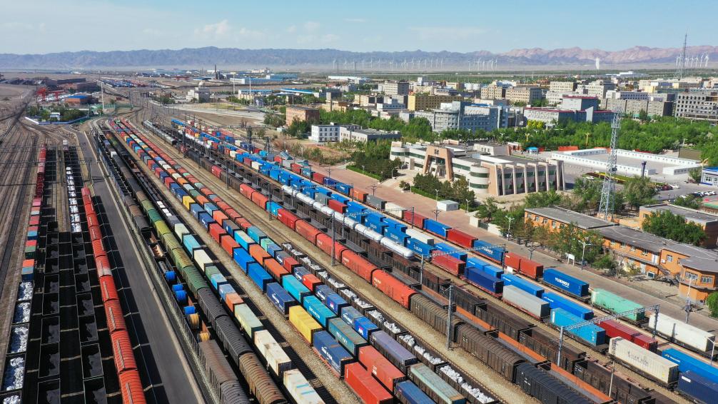 2024年5月25日,在新疆阿拉山口站寬準軌編組場,出入境中歐班列集結(jié)等待出發(fā)(無人機照片)。新華社發(fā)(于暉攝)