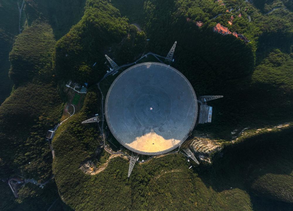 中國天眼在落日余暉中(無人機照片,維護保養(yǎng)期間拍攝,2024年9月25日攝)。新華社記者劉續(xù)攝