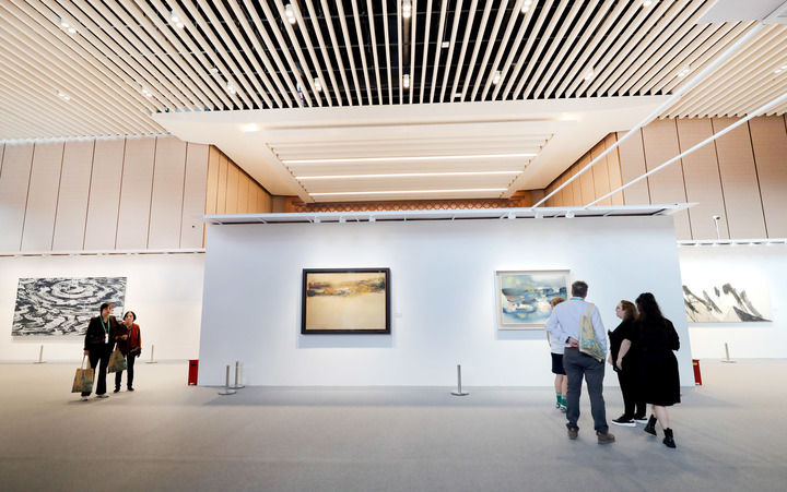 11月9日,觀眾在第七屆進(jìn)博會(huì)國際現(xiàn)當(dāng)代藝術(shù)專區(qū)觀看繪畫藝術(shù)展品。新華社記者方喆攝