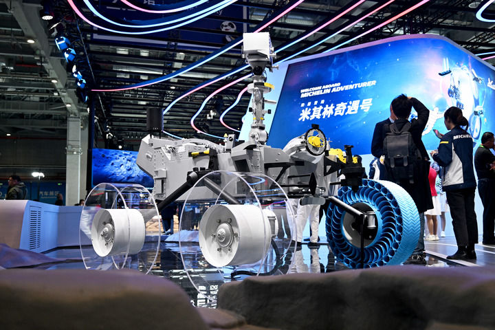 這是11月6日在第七屆進(jìn)博會(huì)汽車展區(qū)拍攝的在亞洲首次亮相的米其林月球探測車輪胎。新華社發(fā)(陳浩明攝)
