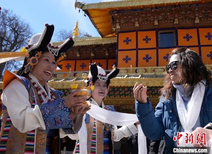 2月20日,2025年香港至拉薩航班首航旅行團(tuán)歡迎儀式現(xiàn)場(chǎng),工作人員向香港游客敬獻(xiàn)青稞酒。李林?jǐn)z