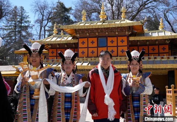 2月20日,2025年香港至拉薩航班首航旅行團(tuán)歡迎儀式現(xiàn)場(chǎng),香港游客梁籌庭(右二)在羅布林卡與身著拉薩傳統(tǒng)服飾的工作人員合影留念。李林?jǐn)z