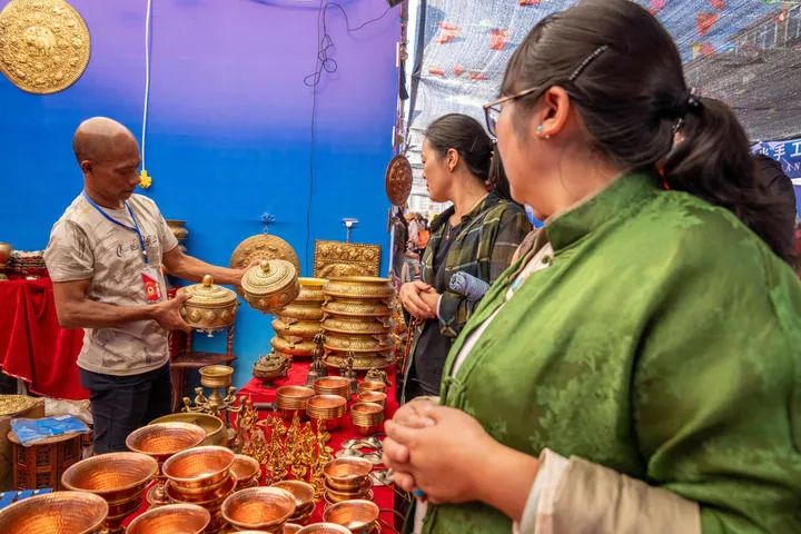 來自尼泊爾的商人阿曼在西藏昌都市首屆尼泊爾進(jìn)口商品展銷會(huì)上向顧客展示商品(2024年8月19日攝)。新華社記者旦增尼瑪曲珠攝