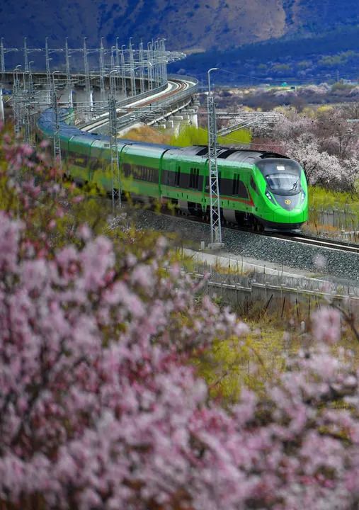 2023年3月21日,復(fù)興號(hào)列車穿行在西藏拉林鐵路林芝段的桃花間。新華社記者覺果攝