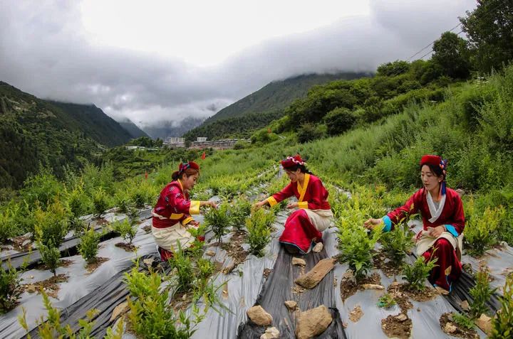 2022年,安徽省援藏工作隊(duì)在勒布溝引入莓茶種植,試驗(yàn)性種植30畝。這是當(dāng)?shù)卮迕裨诓烧瑁?023年7月28日攝)。新華社記者旦增尼瑪曲珠攝