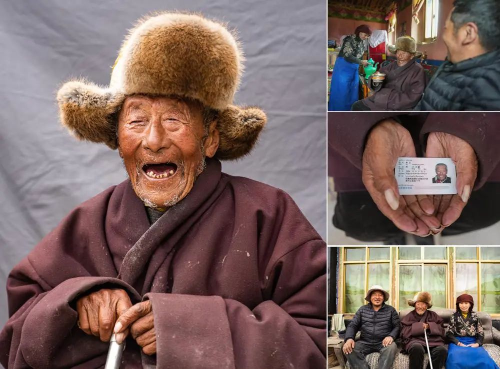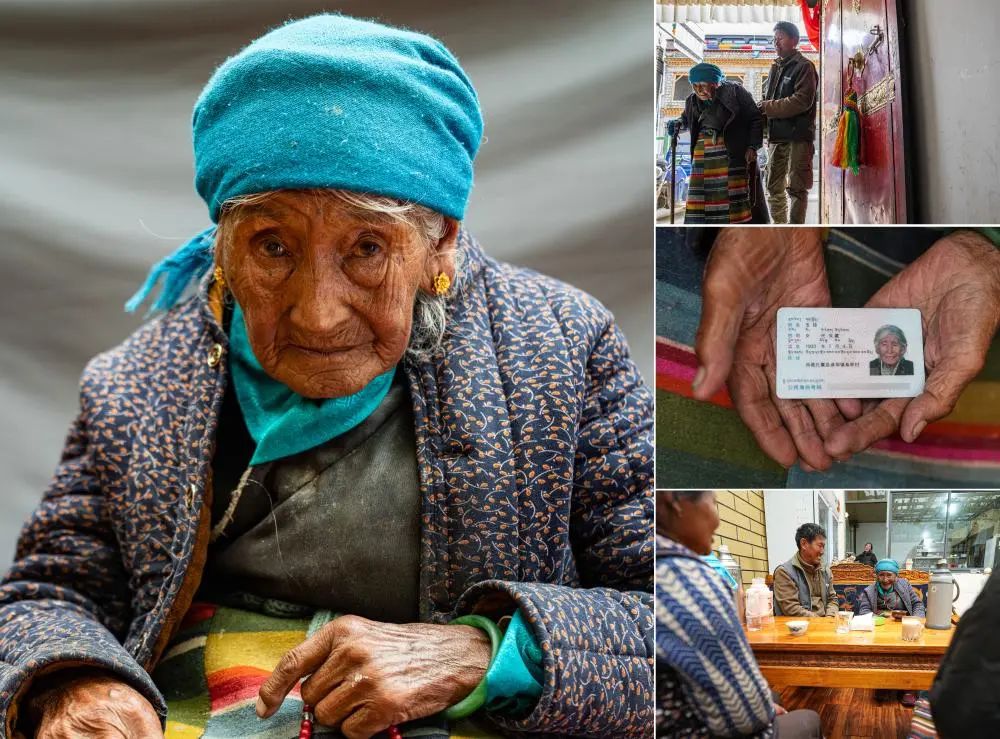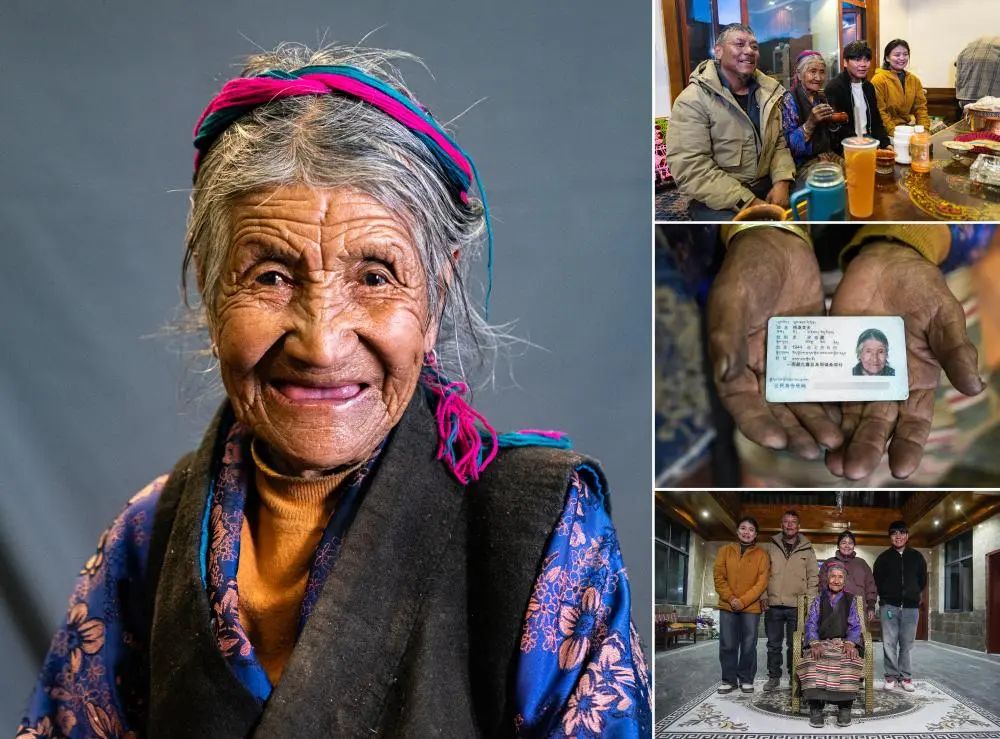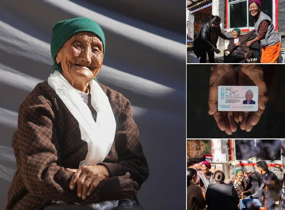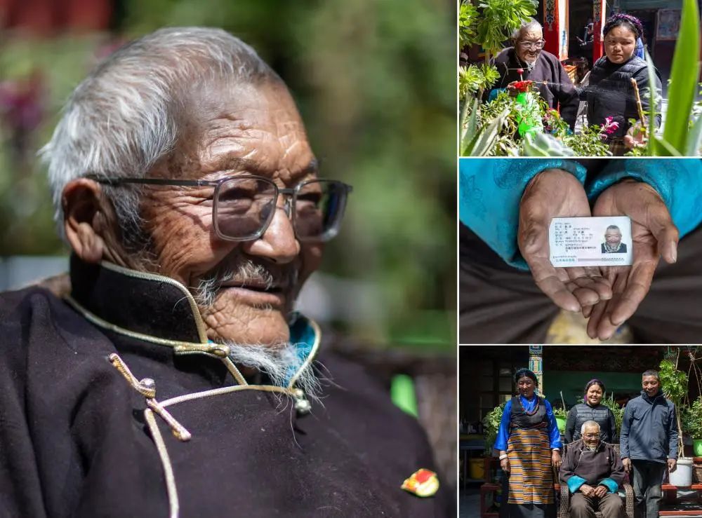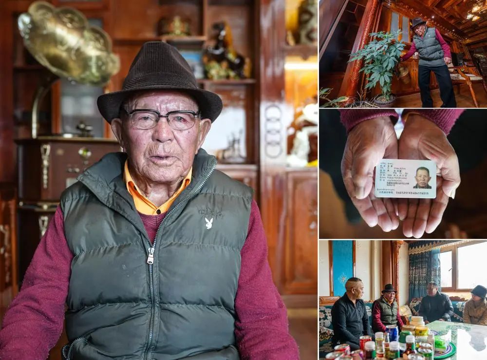 這是一張拼版照片。左:這是索扎老人的肖像(3月20日,新華社記者晉美多吉攝)。右上:索扎老人和家人聊天(3月20日,新華社記者晉美多吉攝)。右中:這是索扎老人的身份證(3月20日,新華社記者晉美多吉攝)。右下:索扎老人和家人合影(3月20日,新華社記者丁增尼達攝)。