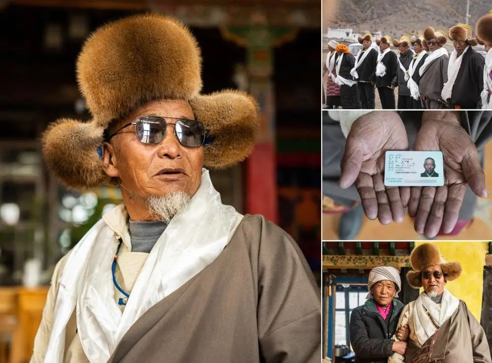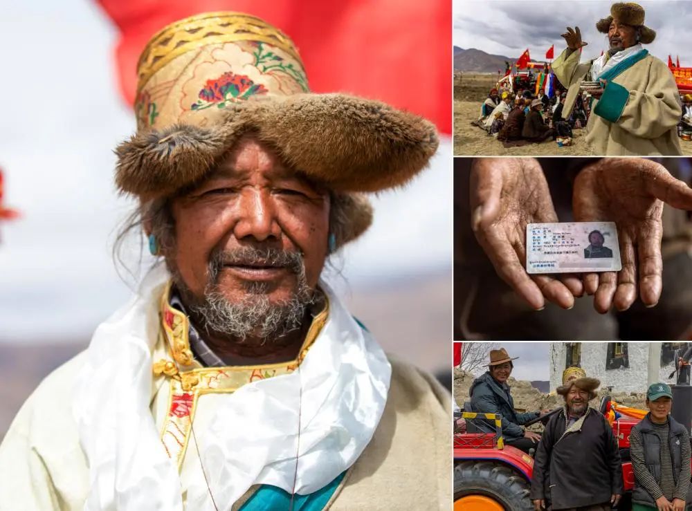 這是一張拼版照片。左:這是尼瑪老人的肖像(3月16日,新華社記者姜帆攝)。右上:作為村中長者,尼瑪在春耕儀式上吟唱祝福豐收的歌謠(3月16日,新華社記者姜帆攝)。右中:這是尼瑪老人的身份證(3月16日,新華社記者姜帆攝)。右下:尼瑪(中)與兒子巴桑次仁(左)、孫女次仁旺姆在家門口合影(3月16日,新華社記者姜帆攝)。