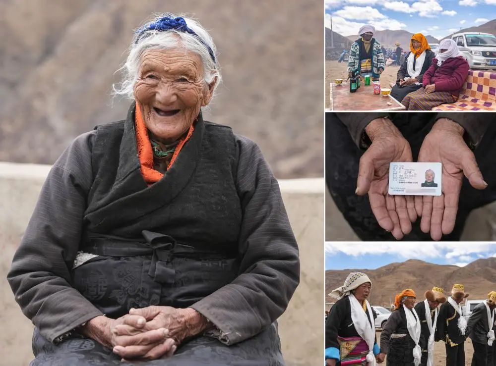 這是一張拼版照片。左:這是白姆老人的肖像(3月16日,新華社記者晉美多吉攝)。右上:在春耕大典上,白姆老人(中)和鄉(xiāng)親在田頭休息(3月16日,新華社記者丁增尼達攝)。右中:這是白姆老人的身份證(3月16日,新華社記者晉美多吉攝)。右下:在春耕大典上,白姆老人(左二)和鄉(xiāng)親一起跳鍋莊(3月16日,新華社記者晉美多吉攝)。