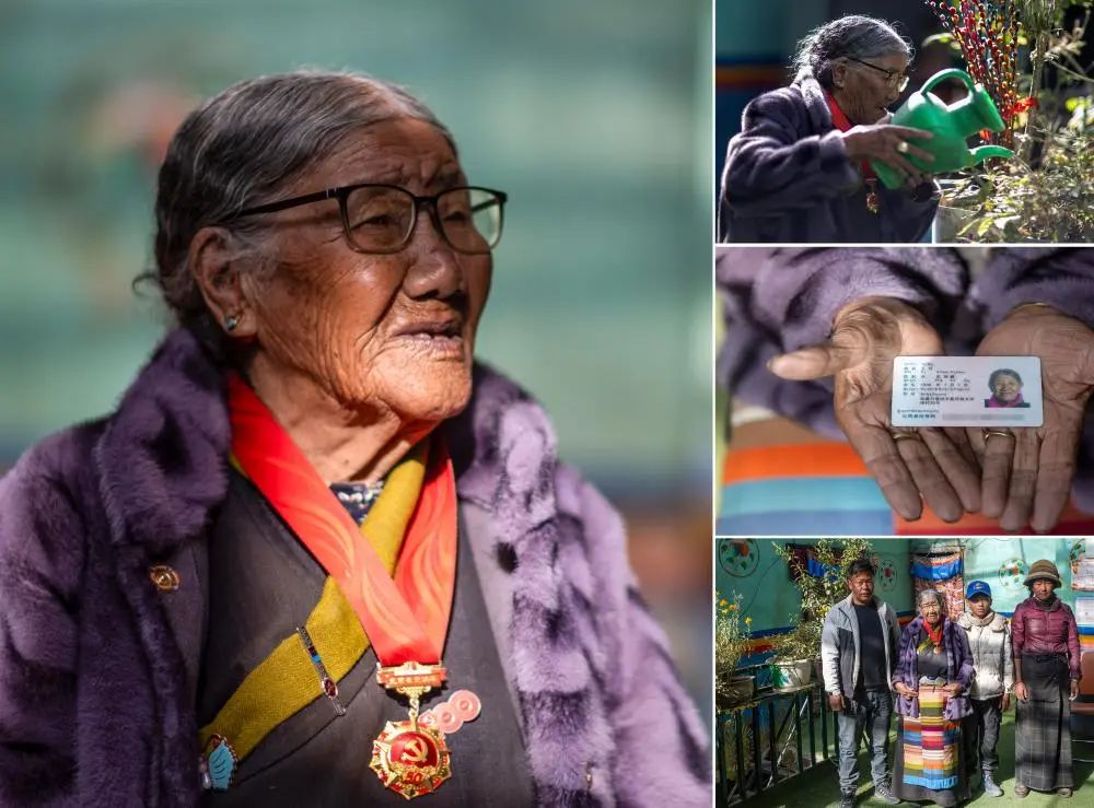 這是一張拼版照片。左:這是玉珍老人的肖像(3月17日,新華社記者姜帆攝)。右上:玉珍老人在家中澆花(3月17日,新華社記者姜帆攝)。右中:這是玉珍老人的身份證(3月17日,新華社記者姜帆攝)。右下:玉珍老人(左二)與孫子羅布次仁(左一)、孫媳婦次仁卓瑪(右一)、曾孫羅布桑珠一起在家中合影(3月17日,新華社記者姜帆攝)。