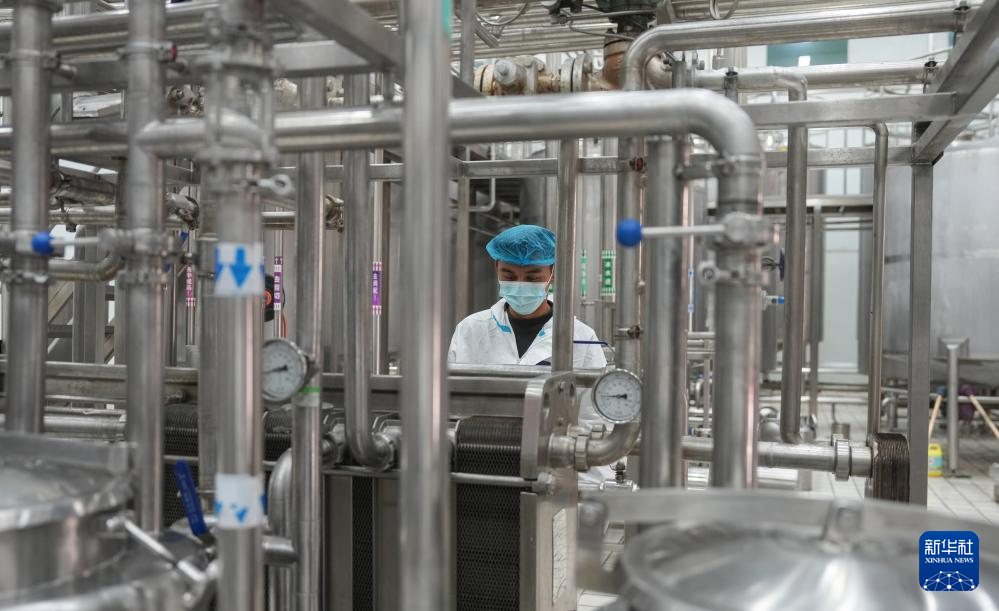 西藏乳制品龍頭企業(yè)藏地吉龍農(nóng)業(yè)開發(fā)有限公司員工在檢查設(shè)備運(yùn)行情況(3月5日攝)。新華社記者晉美多吉攝