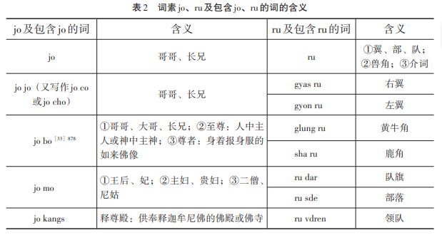 如表2所示,首先,詞素jo和ru均有實(shí)義,然而在語法層面二者需要根據(jù)語境,搭配相應(yīng)的詞綴或修飾語(或中心語)才能構(gòu)成復(fù)合詞。其次,jo經(jīng)歷了從單純詞向復(fù)合詞漸變的過程,其演變路徑有二:①在jo后附加詞綴bo,構(gòu)成復(fù)合詞jo bo;②jo重疊,構(gòu)成復(fù)合詞jo jo。詞典中jo(jo bo)各義項(xiàng)的排列次序恰恰與歷代藏文文獻(xiàn)反映的該詞的詞義演變歷程相合,且歷代藏文文獻(xiàn)呈現(xiàn)了該詞多重詞義并存的情況。