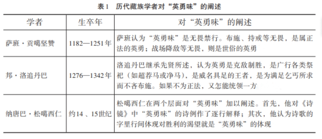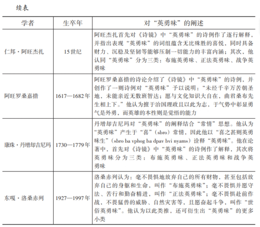 繼薩班之后,歷代學(xué)者以廣注、意解、釋難、概論、字解等形式詮釋梵語詩學(xué)(尤其是檀丁的《詩鏡》)乃至“十明”文化的闡釋實(shí)踐不絕于史,從而形成源遠(yuǎn)流長的藏族詩學(xué)理論闡釋傳統(tǒng),而對(duì)英勇之詩味的解讀和對(duì)英雄形象的闡述也隨之在深度和廣度方面得以拓展,詳見表1。