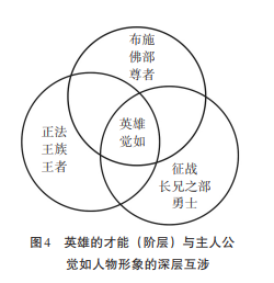 基于上述分析,我們不難從英雄觀內(nèi)涵的嬗變過程及其價(jià)值導(dǎo)向看出,在傳統(tǒng)觀念中,真正的英雄應(yīng)至少具備三種才能——征戰(zhàn)、正法和布施,而這三種才能又可對(duì)應(yīng)社會(huì)結(jié)構(gòu)中的三個(gè)階層——由低到高分別為勇士、王者及尊者(見圖1)。需要注意的是,在佛教弘傳以及其與地方傳統(tǒng)相互調(diào)適和整合的歷史進(jìn)程中,社會(huì)階層與具體才能的對(duì)應(yīng)關(guān)系逐漸被打破。