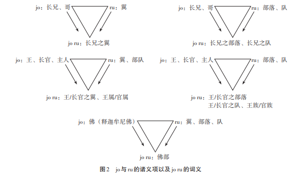 其三,若jo(或jo bo)取“佛(釋迦牟尼佛)”義,結(jié)合ru“部”的義項(xiàng),在史詩語域中jo ru的社會(huì)語義當(dāng)為佛部。可見,命名可以讓信仰、文化象征、神圣觀念等在內(nèi)的各種超越姓名本身的社會(huì)事項(xiàng)凸顯出來。