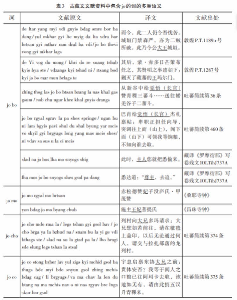 實(shí)際上,jo及包含jo的詞在藏文史料中使用較早,最早可上溯至吐蕃時(shí)期。據(jù)敦煌古藏文文獻(xiàn),包含jo的詞jo bo、jo mo等在史料中并不鮮見,詳見表3。