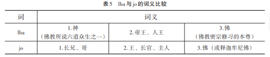 此外,通過對(duì)lha sras文本詞義和社會(huì)語義的分析,不難發(fā)現(xiàn)lha與jo的詞義重疊或交叉現(xiàn)象(見表5),而此類現(xiàn)象又可以作為闡釋個(gè)人名jo ru社會(huì)語義的維度之一。