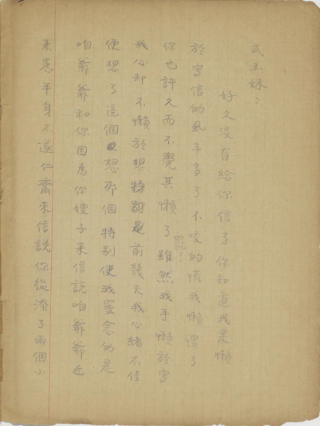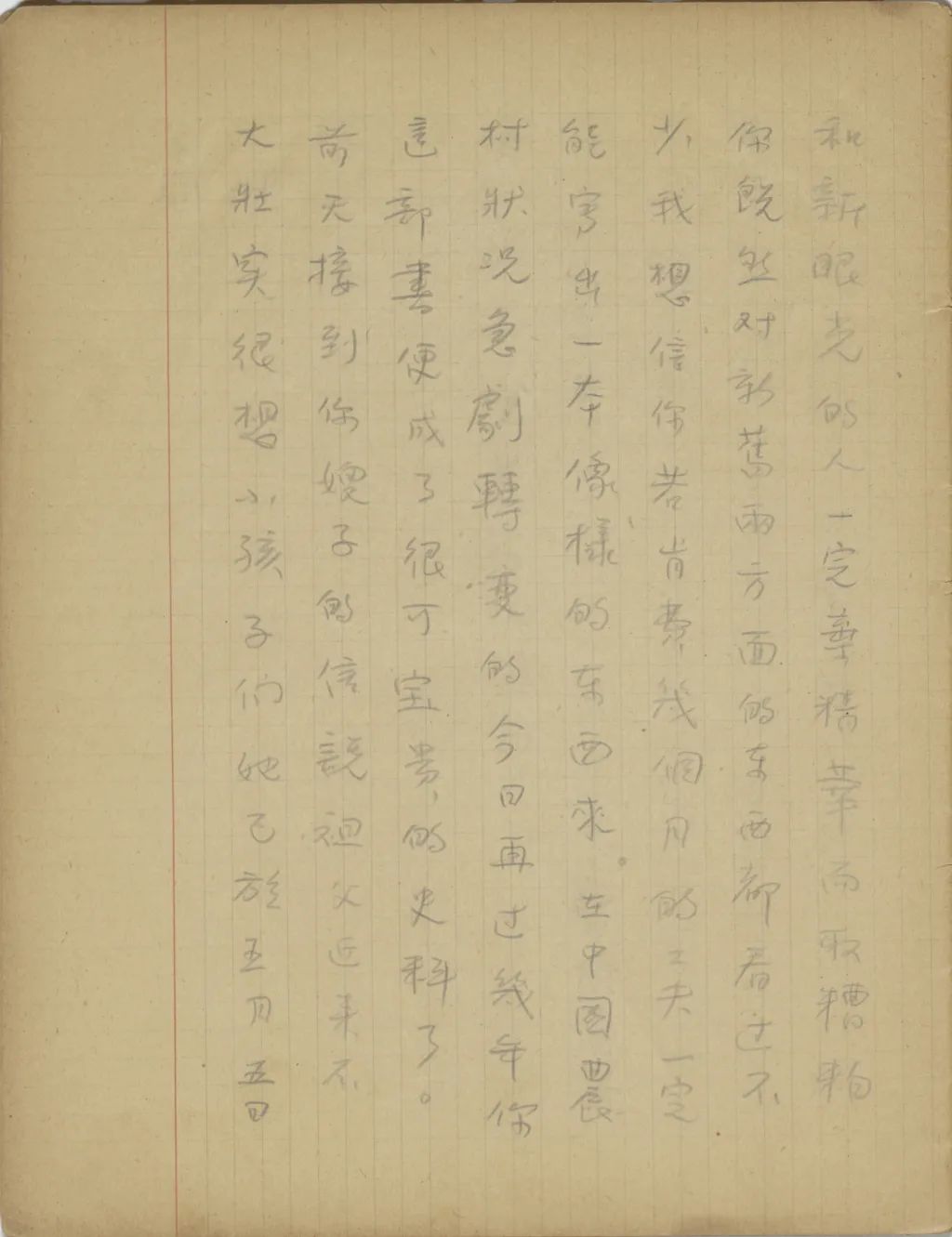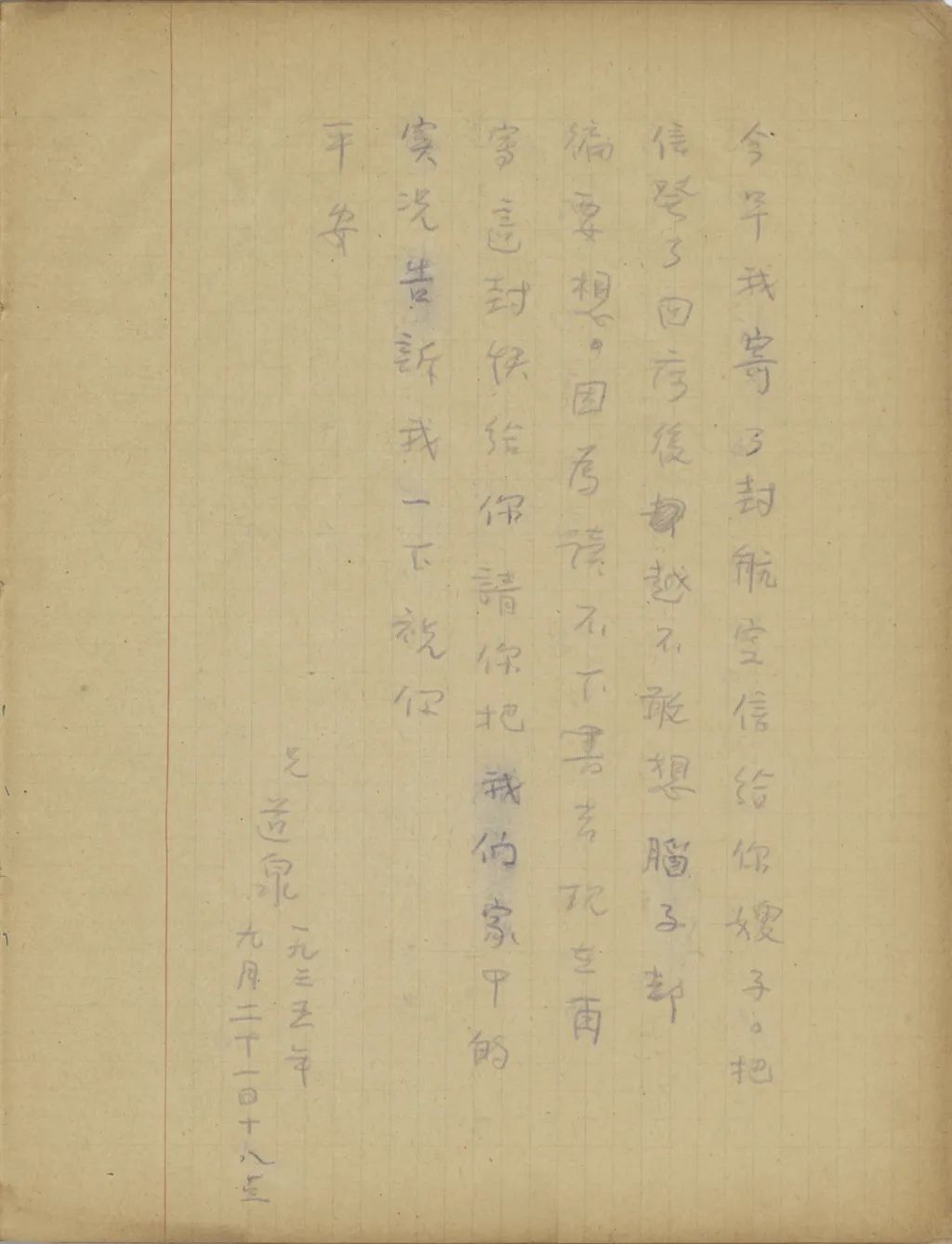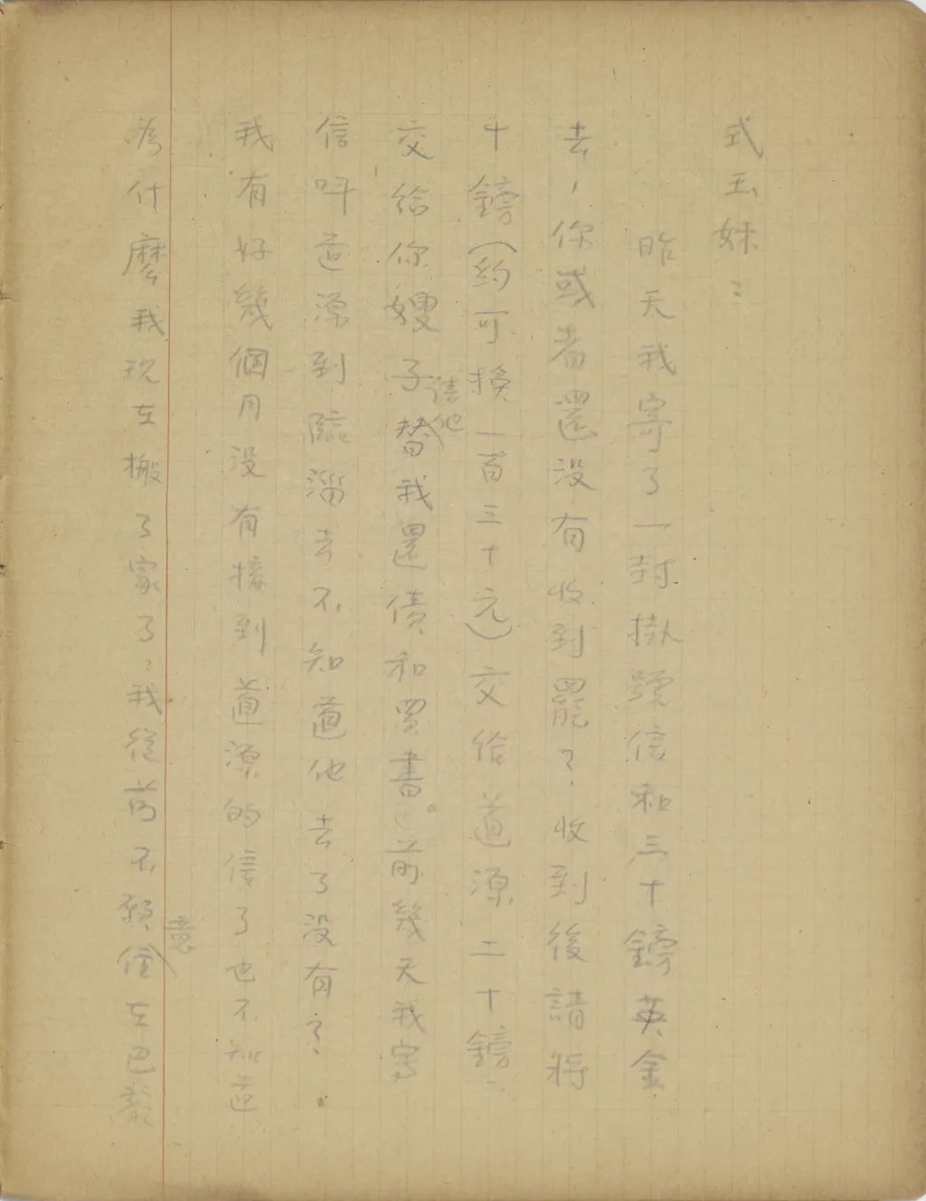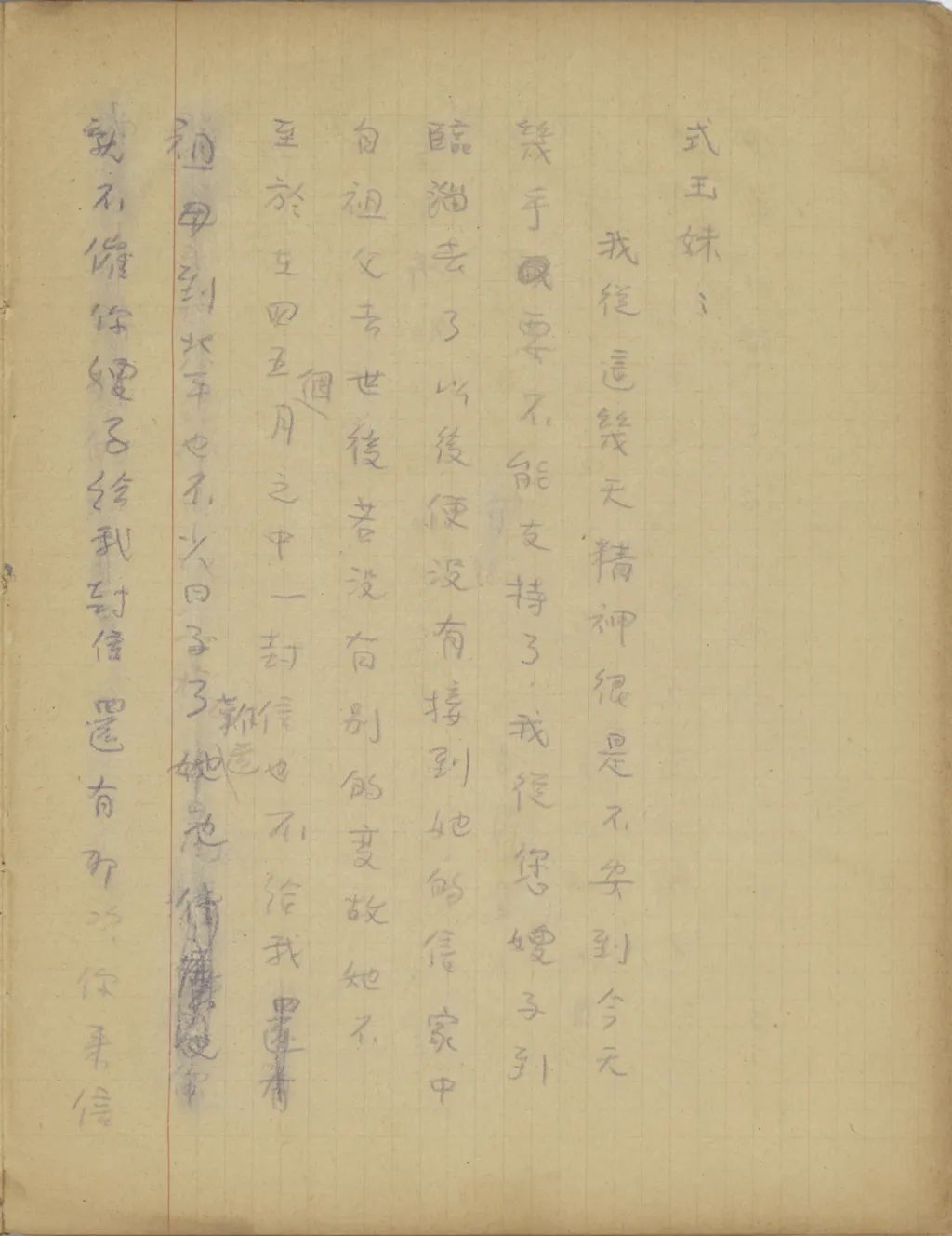 我從這幾天精神很是不安到今天幾乎要不能支持了,我從您嫂子到臨淄去了以后便沒有接到她的信。家中自祖父去世后,若沒有別的變故,她不至于在四五個月之中一封信也不給我。祖母到北平也不少日子了,難道她也就不催你嫂子給我封信?還有那次你來信說,你每禮拜到城里看小培筠一次,為什么你嫂子回臨淄獨把一個小的扔在北平?今天我從這一切事想來想去,便越想越不敢想。式玉妹,我同你嫂子的感情是你所知道的,她若有意外的變故,是我所不能忍受的。不過她若有變故,你們不告訴我也不是辦法,且是她自己又不是不會寫信,若真有我所不敢想的意外事發(fā)生,你們瞞我又能瞞得多久!今年我寄了封航空信給你嫂子。把信發(fā)了回庽(“寓”的別體字,據(jù)艾俊川說)后,越不敢想,腦子卻偏要想。因為讀不下書去,現(xiàn)在再寫這封快〔信〕給你,請你把我們家中的實況告訴我一下。祝你平安。