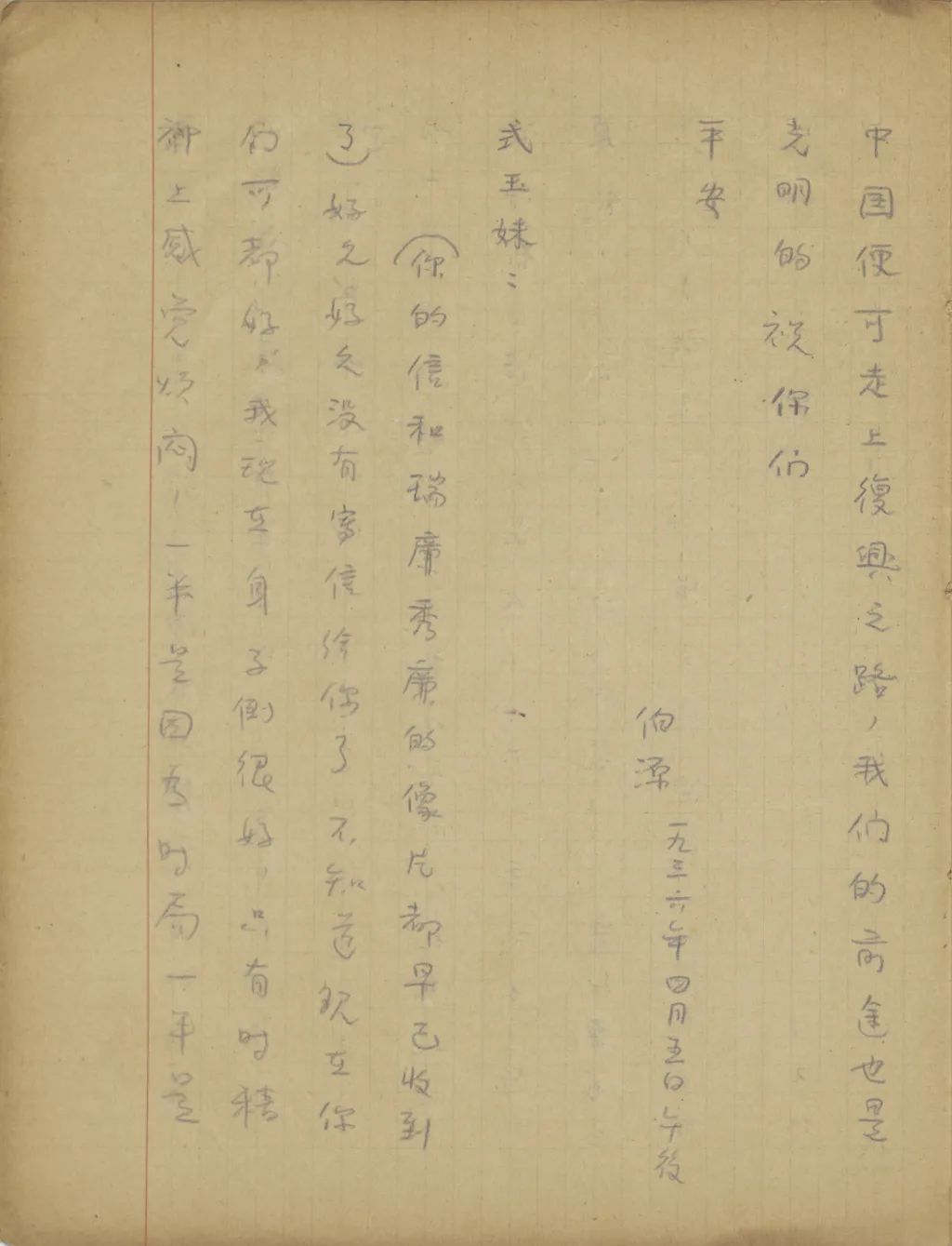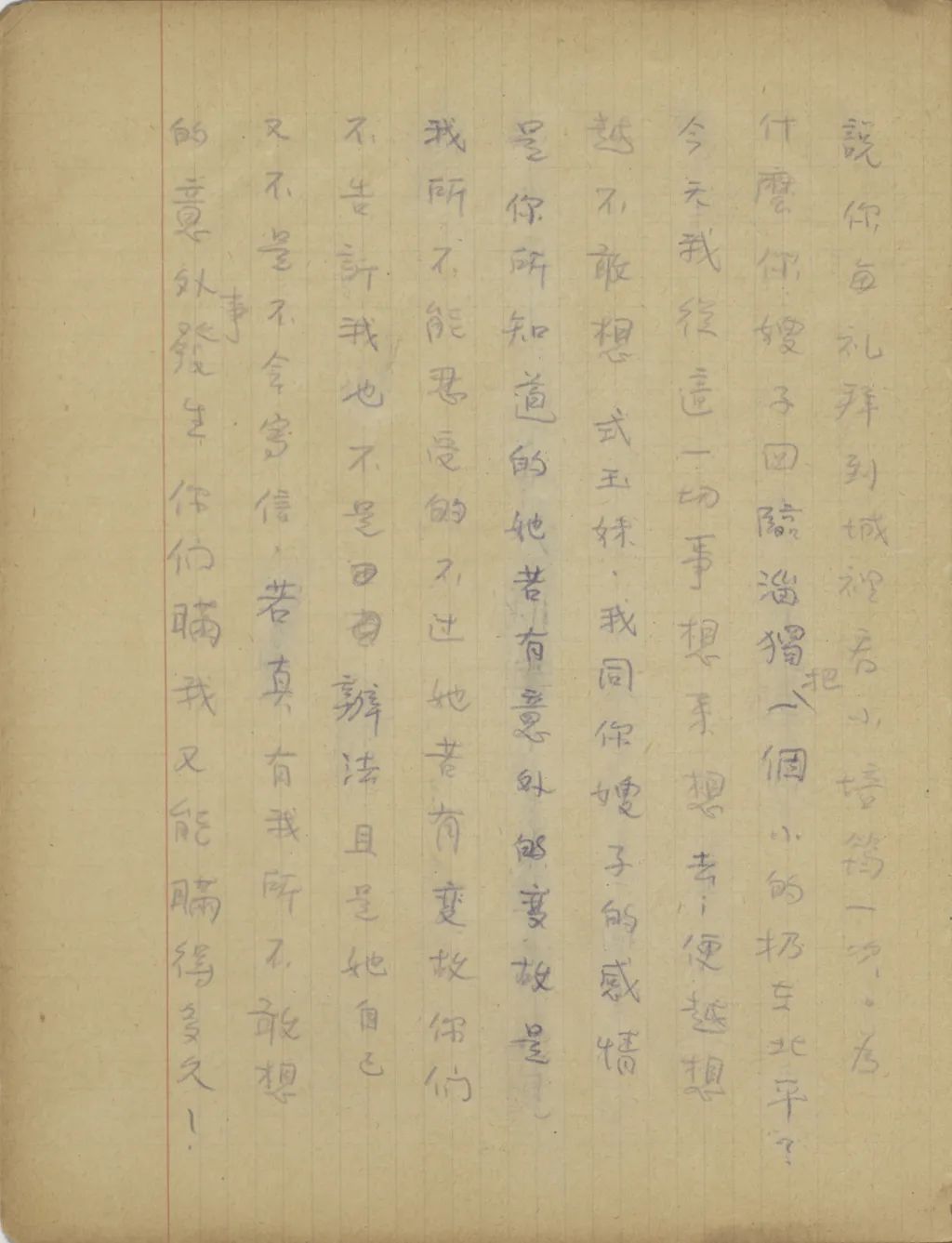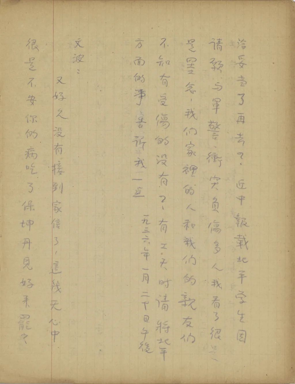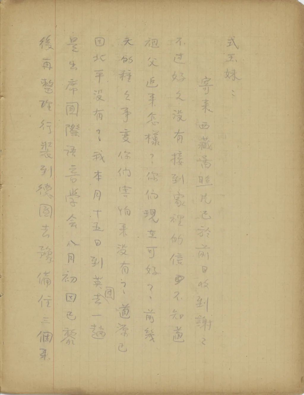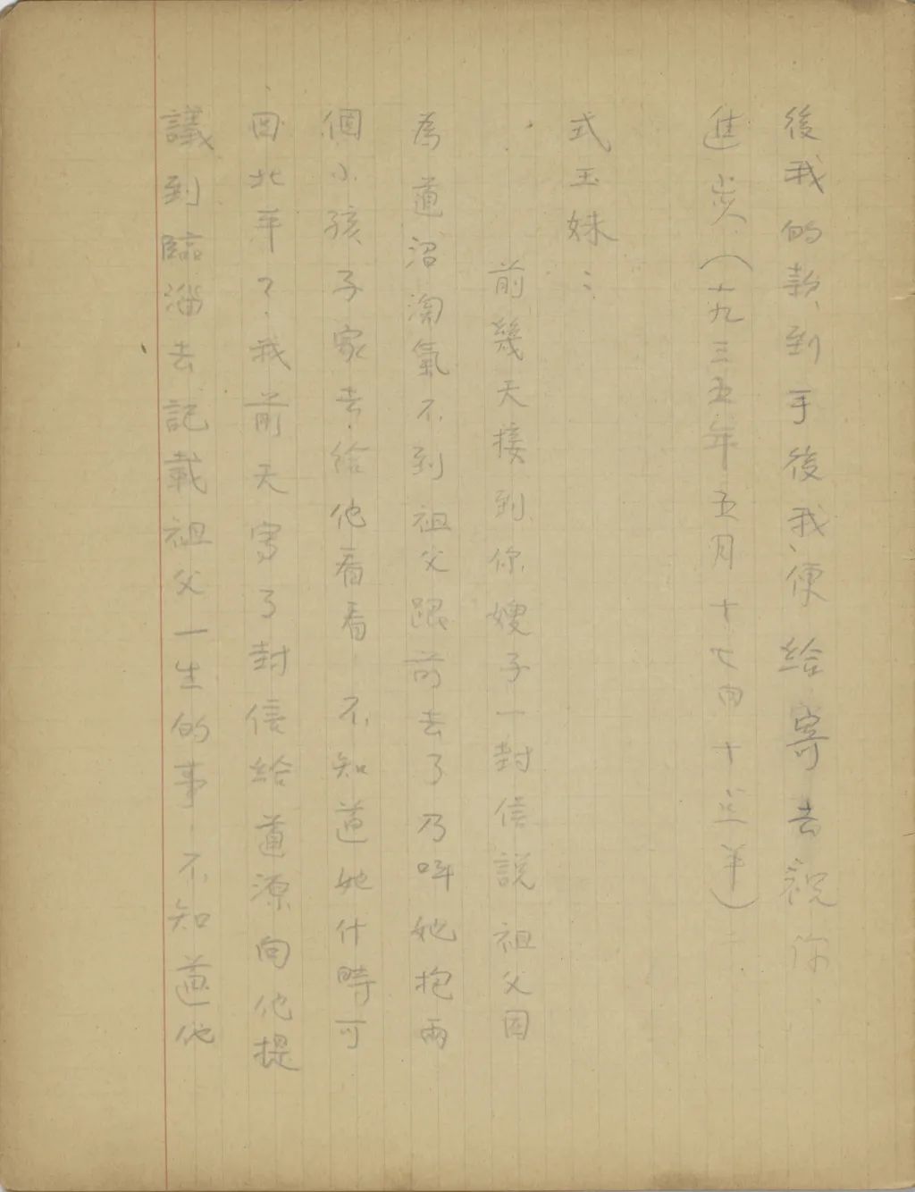 我從這幾天精神很是不安到今天幾乎要不能支持了,我從您嫂子到臨淄去了以后便沒有接到她的信。家中自祖父去世后,若沒有別的變故,她不至于在四五個月之中一封信也不給我。祖母到北平也不少日子了,難道她也就不催你嫂子給我封信?還有那次你來信說,你每禮拜到城里看小培筠一次,為什么你嫂子回臨淄獨把一個小的扔在北平?今天我從這一切事想來想去,便越想越不敢想。式玉妹,我同你嫂子的感情是你所知道的,她若有意外的變故,是我所不能忍受的。不過她若有變故,你們不告訴我也不是辦法,且是她自己又不是不會寫信,若真有我所不敢想的意外事發(fā)生,你們瞞我又能瞞得多久!今年我寄了封航空信給你嫂子。把信發(fā)了回庽(“寓”的別體字,據(jù)艾俊川說)后,越不敢想,腦子卻偏要想。因為讀不下書去,現(xiàn)在再寫這封快〔信〕給你,請你把我們家中的實況告訴我一下。祝你平安。