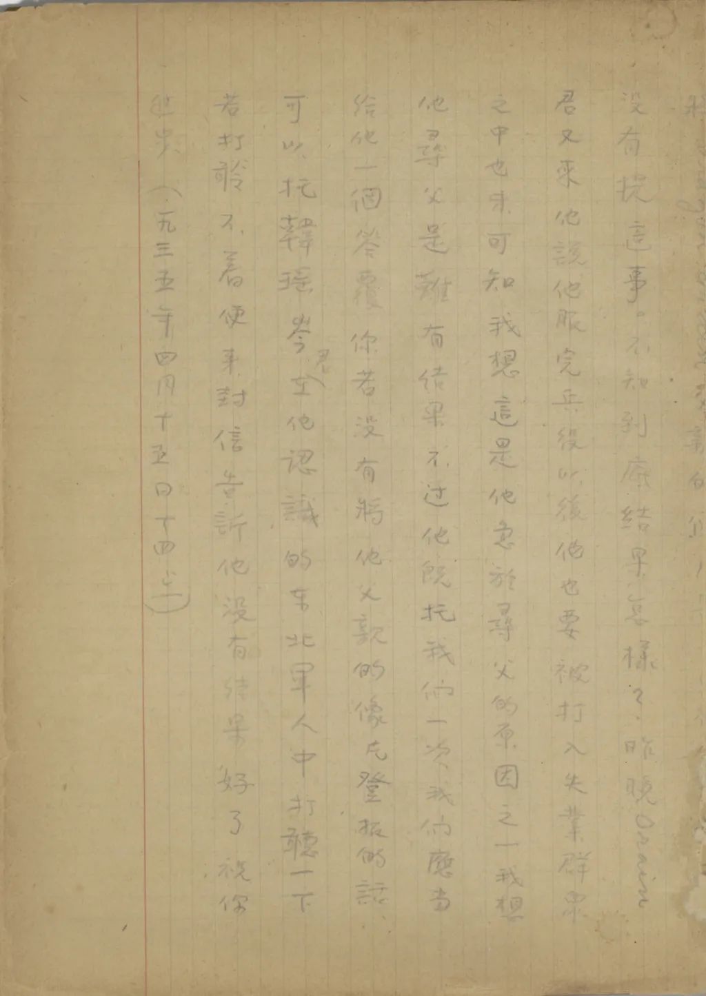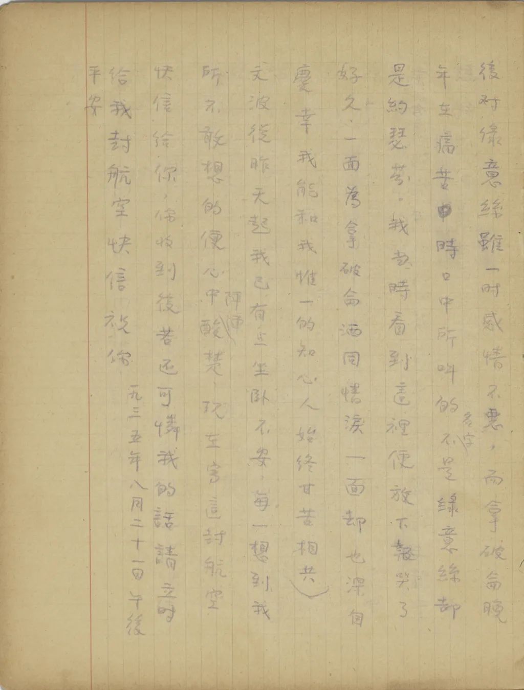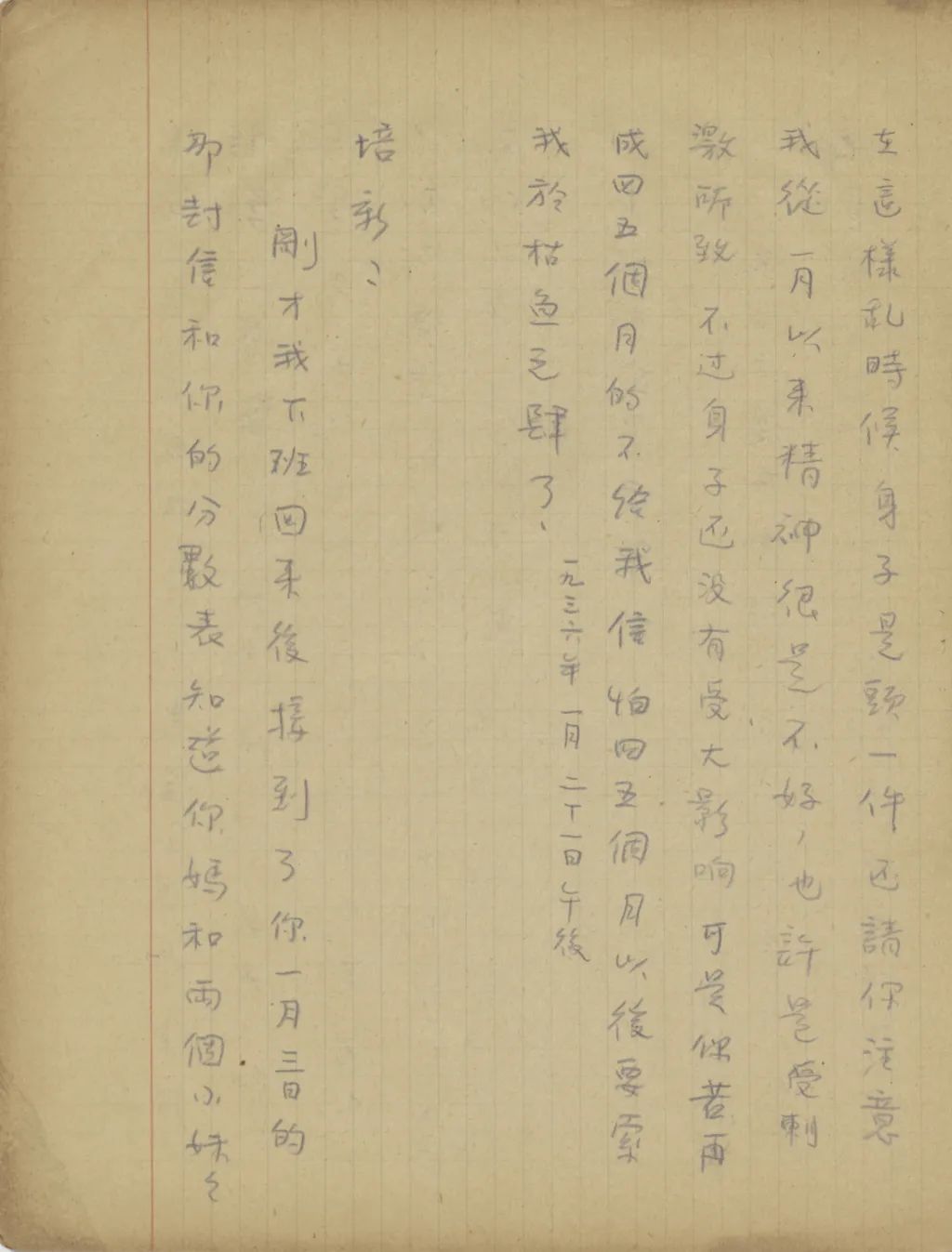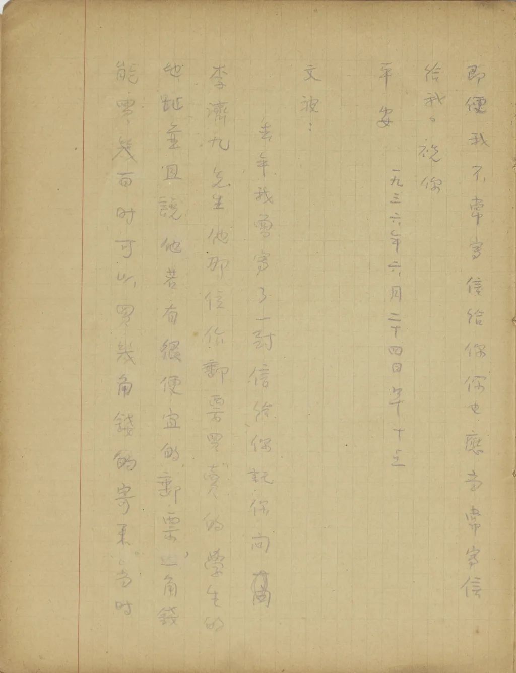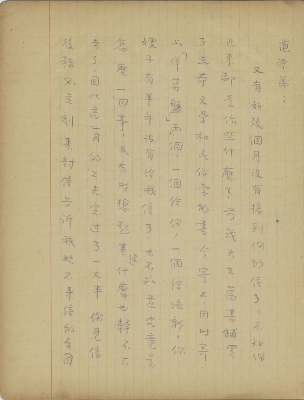 我從這幾天精神很是不安到今天幾乎要不能支持了,我從您嫂子到臨淄去了以后便沒有接到她的信。家中自祖父去世后,若沒有別的變故,她不至于在四五個月之中一封信也不給我。祖母到北平也不少日子了,難道她也就不催你嫂子給我封信?還有那次你來信說,你每禮拜到城里看小培筠一次,為什么你嫂子回臨淄獨把一個小的扔在北平?今天我從這一切事想來想去,便越想越不敢想。式玉妹,我同你嫂子的感情是你所知道的,她若有意外的變故,是我所不能忍受的。不過她若有變故,你們不告訴我也不是辦法,且是她自己又不是不會寫信,若真有我所不敢想的意外事發(fā)生,你們瞞我又能瞞得多久!今年我寄了封航空信給你嫂子。把信發(fā)了回庽(“寓”的別體字,據(jù)艾俊川說)后,越不敢想,腦子卻偏要想。因為讀不下書去,現(xiàn)在再寫這封快〔信〕給你,請你把我們家中的實況告訴我一下。祝你平安。