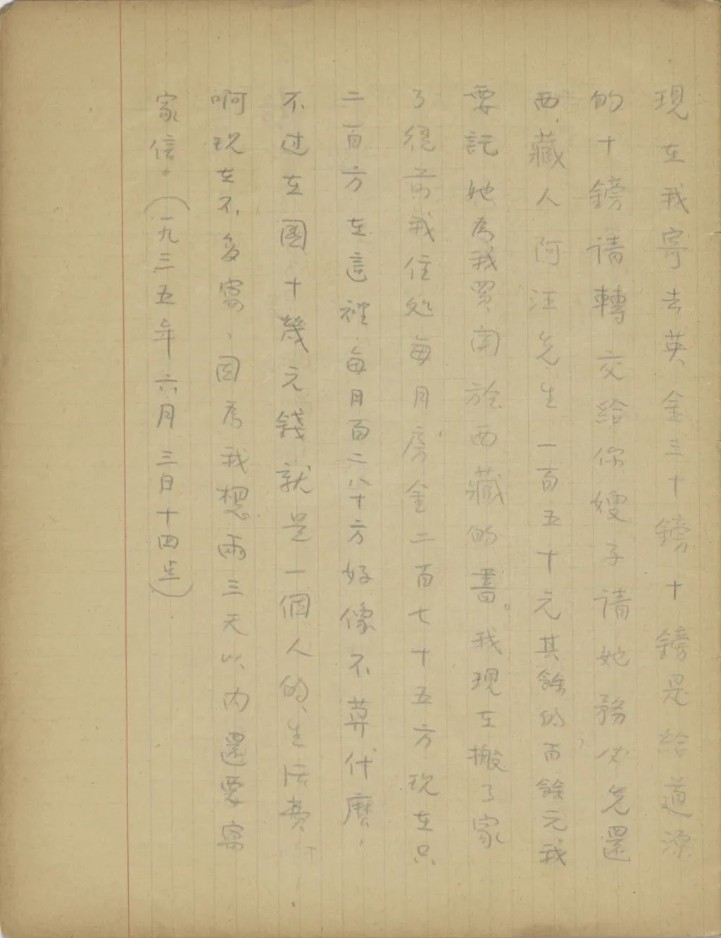 前天接了你嫂子一封信,說你一月以前患盲腸炎,現(xiàn)在已經(jīng)好了,雖說好了,你還是常找醫(yī)生檢查著,時時小心才好?,F(xiàn)在我寄去英金三十鎊,十鎊是給道源的,十鎊請轉(zhuǎn)交給你嫂子,請她務必先還西藏人阿汪先生一百五十元,其余的百余元我要托她為我買關(guān)于西藏的書。我現(xiàn)在搬了家了,從前我住處每月房金二百七十五方(方=franc=法郎、佛郎),現(xiàn)在只二百方。在這里每月百二八十方好像不算什么,不過在國十幾元錢就是一個人的生活費啊。現(xiàn)在不多寫,因為我想兩三天以內(nèi)還要寫家信。(一九三五年六月三日十四點)