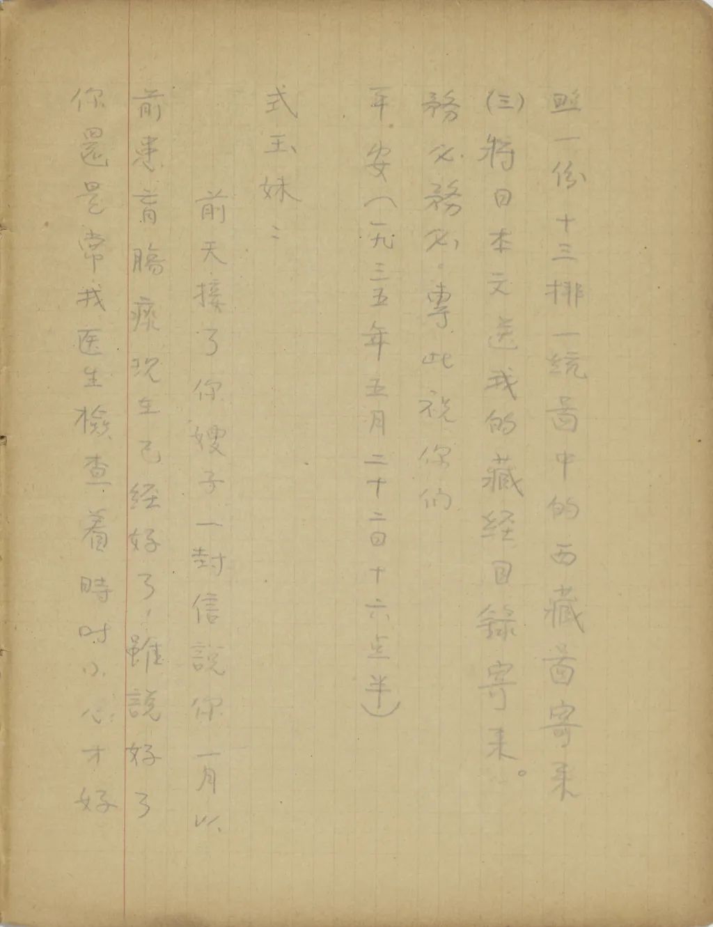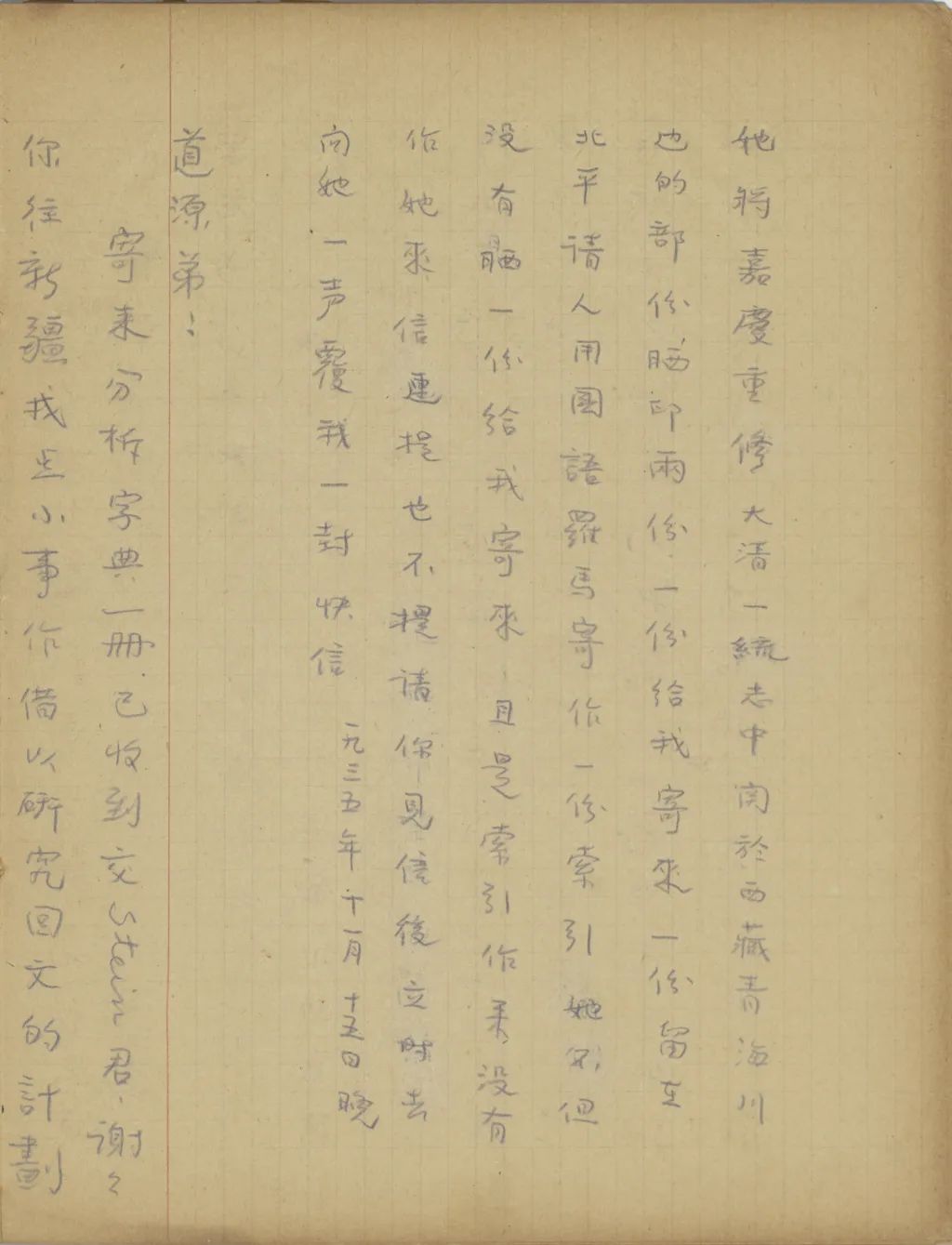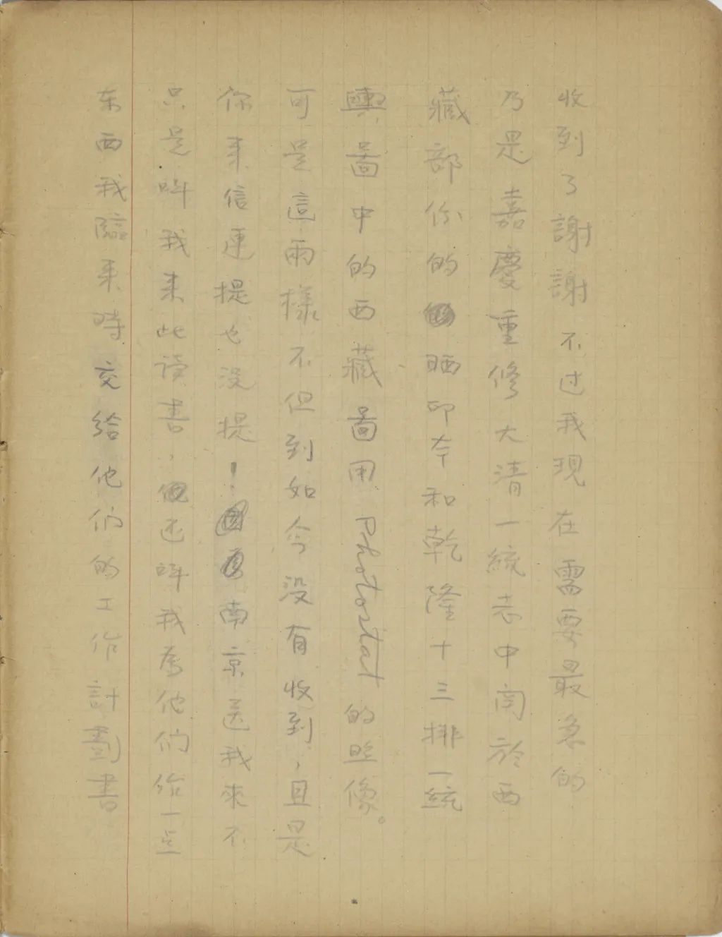 你寄來的像片和《四體文鑒索引》都收到了,謝謝。不過我現(xiàn)在需要最急的,乃是《嘉慶重修大清一統(tǒng)志》中關(guān)于西藏部份的曬印本和《乾隆十三排一統(tǒng)輿圖》中的西藏圖用photostat的照像。可是這兩樣不但到如今沒有收到,且是你來信連提也沒提!南京送我來,不只是叫我來此讀書,還叫我為他們作一點東西。我臨來時,交給他們的工作計劃書便是作西藏地名之研究。我來了已有一年,還沒一點東西交給他們。這一次的津貼,又過了快一月了,還沒有寄來,也或者是因為我沒有成績寄去罷?你見信后,請立時(一)設法曬印兩份《嘉慶重修大清一統(tǒng)志》中的《西藏志》。一份裝訂了寄給我,一份你留下找人替我用國語羅馬字作一份索引。作完后,用打字機打四五份,給我寄兩份來。(二)到圖書館用photostat照一份《十三排一統(tǒng)圖》中的西藏圖寄來。(三)將日本文[人?]送我的藏經(jīng)目錄寄來。務必務必。專此,祝你們平安。(一九三五年五月二十二日十六點半)