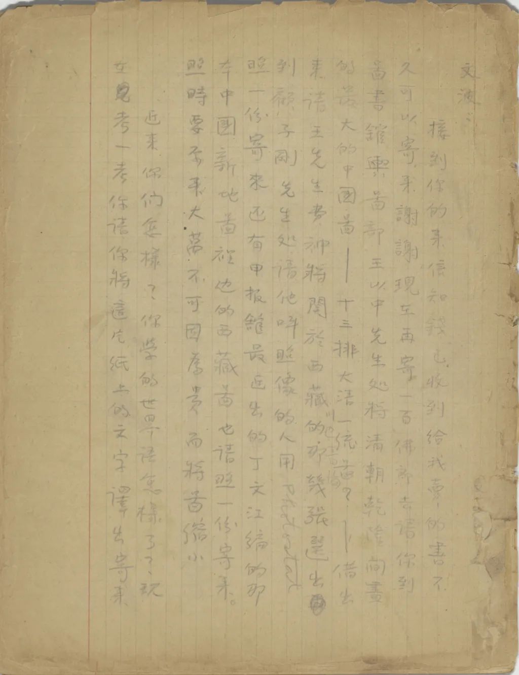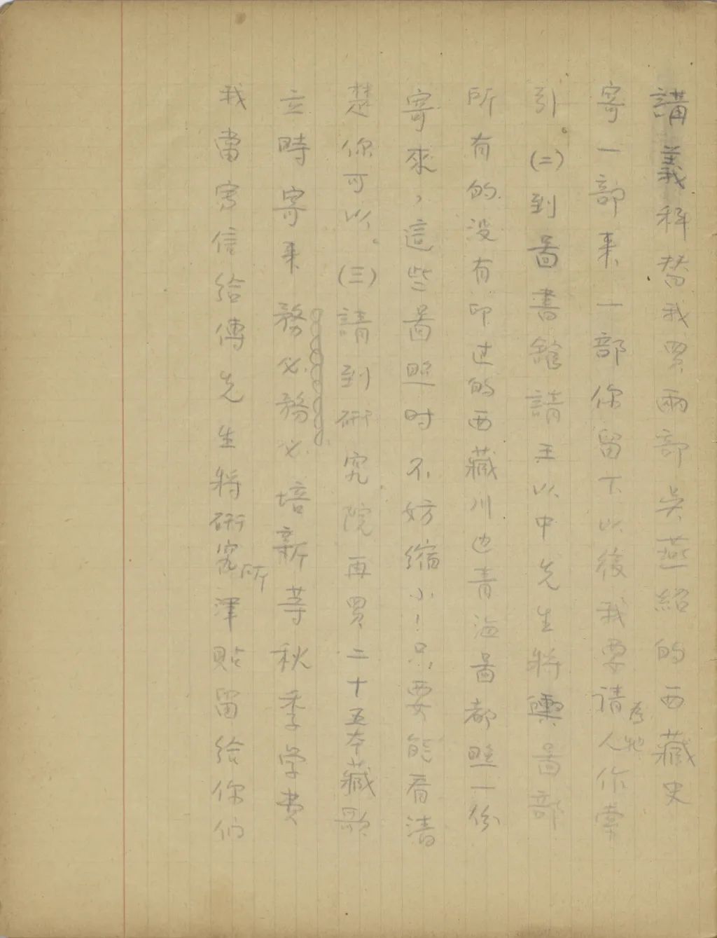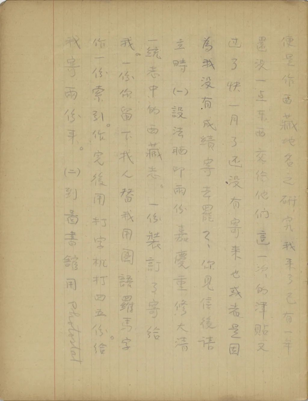 你寄來的像片和《四體文鑒索引》都收到了,謝謝。不過我現(xiàn)在需要最急的,乃是《嘉慶重修大清一統(tǒng)志》中關(guān)于西藏部份的曬印本和《乾隆十三排一統(tǒng)輿圖》中的西藏圖用photostat的照像。可是這兩樣不但到如今沒有收到,且是你來信連提也沒提!南京送我來,不只是叫我來此讀書,還叫我為他們作一點東西。我臨來時,交給他們的工作計劃書便是作西藏地名之研究。我來了已有一年,還沒一點東西交給他們。這一次的津貼,又過了快一月了,還沒有寄來,也或者是因為我沒有成績寄去罷?你見信后,請立時(一)設法曬印兩份《嘉慶重修大清一統(tǒng)志》中的《西藏志》。一份裝訂了寄給我,一份你留下找人替我用國語羅馬字作一份索引。作完后,用打字機打四五份,給我寄兩份來。(二)到圖書館用photostat照一份《十三排一統(tǒng)圖》中的西藏圖寄來。(三)將日本文[人?]送我的藏經(jīng)目錄寄來。務必務必。專此,祝你們平安。(一九三五年五月二十二日十六點半)