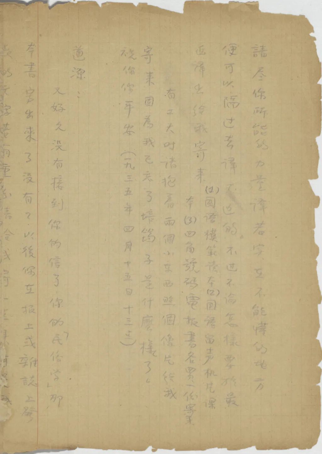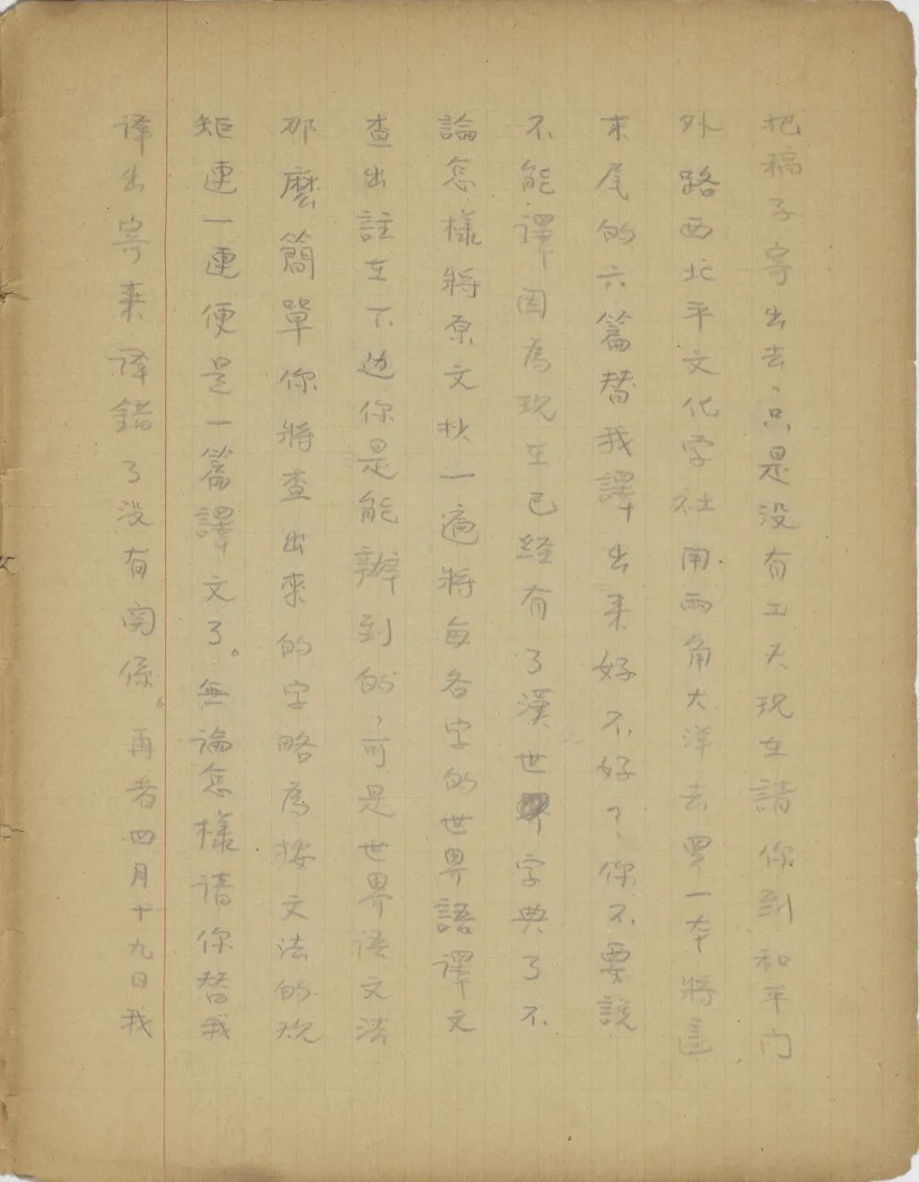 近來你們怎樣?你學的世界語怎樣了?現(xiàn)在考一考你,請你將這片紙上的文字譯出寄來,請盡你所能的力量譯,若實在不能懂的地方,便可以隔過去譯下邊的。不過不論怎樣,要于最近譯出給我寄來。(1)《國語模范讀本》(2)《國語留聲機片課本》(3)《四角號碼電報書》,各買一份寄來。