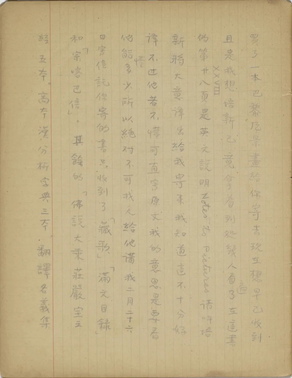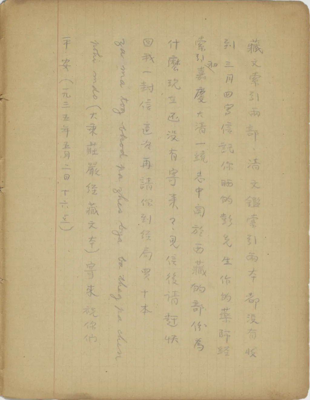 你的世界語學的怎樣了?現(xiàn)在有一件事求你。落華生的《無法投遞的郵件》,我只譯了十一篇。從第十二《給伊紅》以后,我都沒有譯。現(xiàn)在我想譯,把稿子寄出去,只是沒有工夫。現(xiàn)在請你到和平門外路西北平文化學社,用兩角大洋去買一本,將這末尾的六篇替我譯出來好不好?你不要說不能譯,因為現(xiàn)在已經(jīng)有了《漢世字典》了,不論怎樣將原文抄一遍,將每各[個]字的世界語譯文查出,注在下邊,你是能辦到的,可是世界語文法那么簡單,你將查出來的字略為按文法的規(guī)矩連一連,便是一篇譯文了。無論怎樣,請你替我譯出寄來,譯錯了沒有關(guān)系。再者,四月十九日,我買了一本巴黎風景畫給你寄去,現(xiàn)在想早已收到。且是我想培新已竟[經(jīng)]拿著到處幾人看遍了。在這書的第廿八(XXVIII)頁是英文說明Notes to Pictures,請叫培新將大意譯出給我寄來。我知道這不十分好譯,不過他若不懂,可直寫原文。我的意思是要看他能懂多少,所以絕對不可找人給他講。我二月二十六日寫信托你寄的書,只收到了《藏歌》《滿文目錄》和《宗喀巴信》,其余的《佛說大乘莊嚴寶王經(jīng)》五本,高本漢《分析字典》三本,《翻譯名義集藏文索引》兩部,《清文鑒索引》兩本,都沒有收到。三月四〔日〕寫信托你曬的彭先生作的《藥師經(jīng)索引》和《嘉慶大清一統(tǒng)志》中關(guān)于西藏的部分,為什么現(xiàn)在還沒有寄來?見信后,請趕快回我一封信。這次再請你到經(jīng)局買十本za ma tog bkod pa zhes bya ba theg pa chen pohi mdo(《大乘莊嚴經(jīng)》藏文本)寄來。祝你們平安。(一九三五年五月二日十六點)