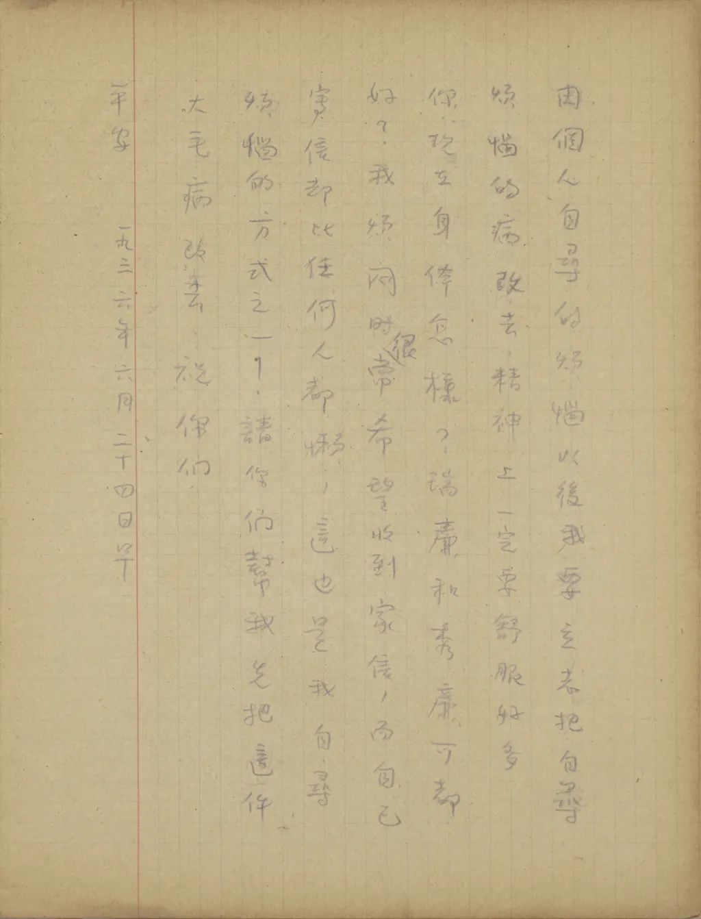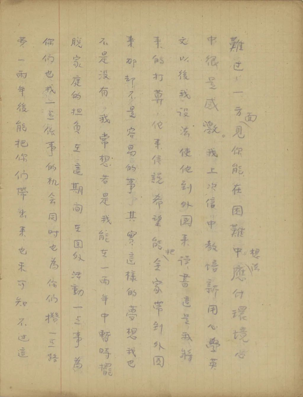 (你的信和瑞廉秀廉的像片都早已收到了)好久好久沒有家信給你了,不知道現(xiàn)在你們可都好。我現(xiàn)在身子倒很好,只有時精神上感覺煩悶,一半是因為時局,一半是因個人自尋的煩惱。以后我要立志把自尋煩惱的病改去,精神上一定要舒服好多。你現(xiàn)在身體怎樣?瑞廉和秀廉可都好?我煩悶時很常希望收到家信,而自己寫信卻比任何人都懶,這也是我自尋煩惱的方式之一!請你們幫我先把這件大毛病改去,祝你們平安。