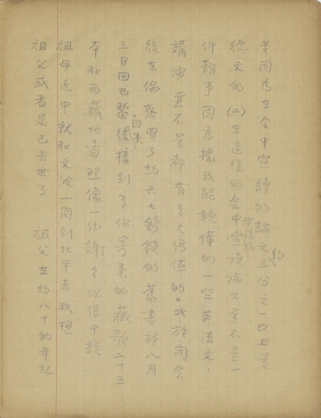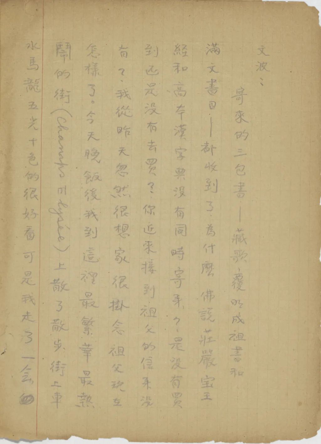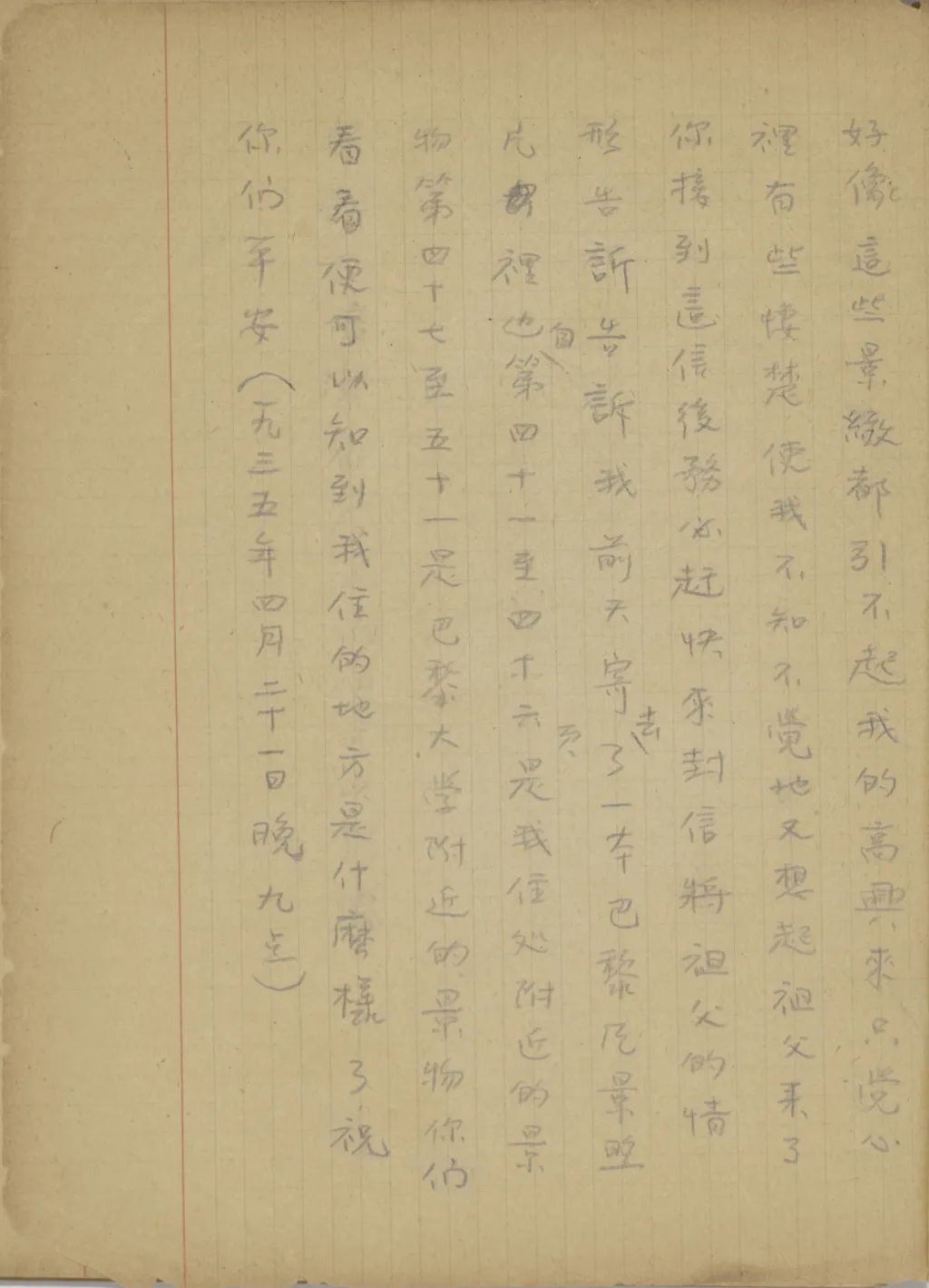寄來的三包書——《藏歌》、《復明成祖書》和《滿文書目》——都收到了。為什么《佛說莊嚴寶王經(jīng)》和高本漢《字典》沒有同時寄來?是沒有買到,還是沒有去買?你近來接到祖父的信來沒有?我從昨天忽然很想家,很掛念祖父現(xiàn)在怎樣了。今天晚飯后,我到這里最繁華最熱鬧的街(Champs-Elysée[élysées])上散了散步。街上車水馬龍,五光十色的很好看,可是我走了一會,好像這些景致都引不起我的高興來,只覺心里有些凄楚,使我不知不覺地又想起祖父來了。你接到這信后,務必趕快來封信,將祖父的情形告訴告訴我。前天寄去了一本巴黎風景照片,里邊自第四十一至四十六頁是我住處附近的景物,第四十七至五十一是巴黎大學附近的景物。你們看看便可以知到[道]我住的地方是什么樣了。祝你們平安(一九三五年四月二十一日晚九點)