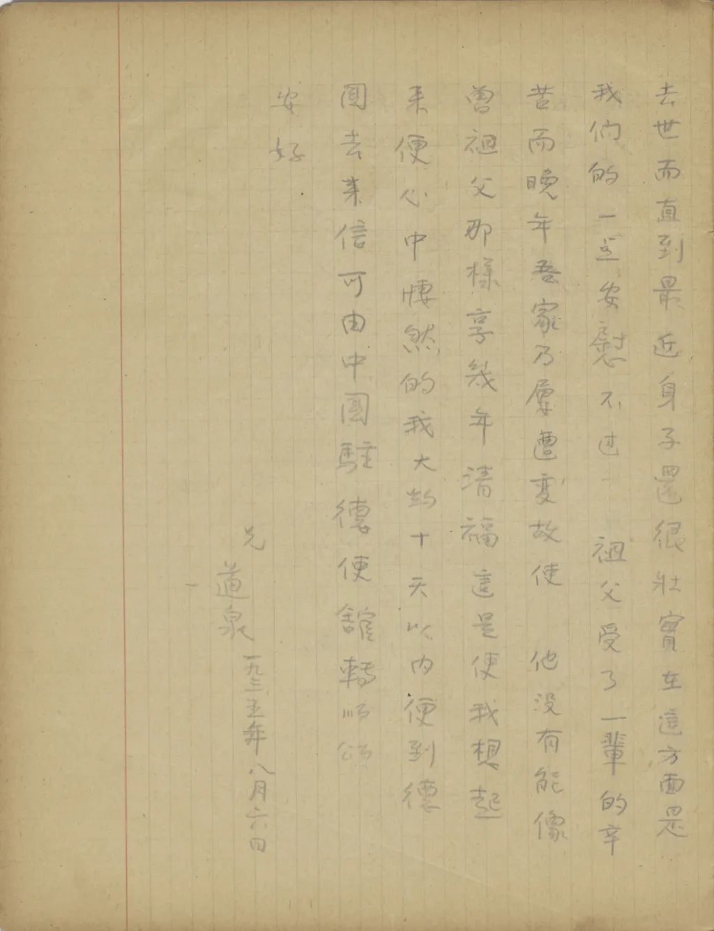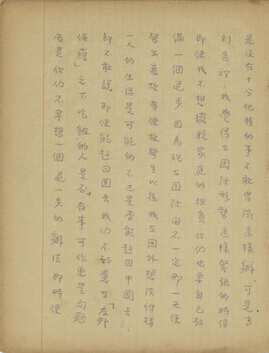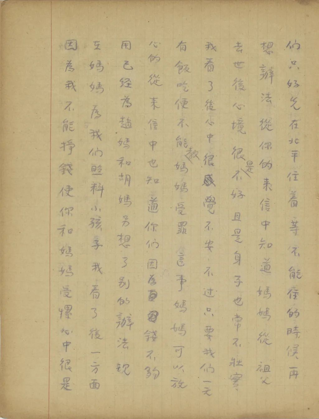 你同培新來的幾封信都收到了。我上一次給你寫信時,是因為這里報載遠東形式極為緊張,所以教你把東西收拾一下,作隨時能離開北平的準備。不過近來國內(nèi)形勢又有很大的變化,[中國?]已經(jīng)找不到安全的地方,所以你們只好先在北平住著,等不能住的時候再想辦法。從你的來信中,知道媽媽從祖父去世后心境很是不好,且是身子也常不壯實。我看了后,心中很覺不安,不過只要我們一天有飯吃,便不能教媽媽受罪。這事媽媽可以放心的。從來信中也知道,你們因為錢不夠用,已經(jīng)為趙媽和胡媽另想了別的辦法,現(xiàn)在媽媽為我們照料小孩子。我看了后,一方面因為我不能掙錢,使你和媽媽受累,心中很是難過,一方面見你能在困難中想法應付環(huán)境,心中很是感激。我上次信中教培新用心學英文,以后我設法使他到外國來讀書,這是我將來的打算。他來信說,希望能把全家?guī)У酵鈬鴣?,那卻不是容易的事。其實,這樣的夢想,我也不是沒有。我常想,若是我能在一兩年中暫時擺脫家庭的擔負,在這期間在國外活動一點事,為你們也找一點作事的機會,同時也為你們攢一點路費,一兩年后能把你們帶出來也未可知。不過這是沒有十分把握的事,不敢冒險這樣辦??墒菍懙竭@里,我覺得在國際形勢這樣緊張的時候,即便我不想擺脫家庭的擔負,你們也要自己預備一個退步。因為現(xiàn)在國際間不一定那[哪]一天便發(fā)生變故,等便[變]故發(fā)生以后,我在國外想法維持一人的生活是可能的,不過是否能趕回中國去卻不敢說,即便能趕回國去,我們不愿意在“友邦保護”之下吃飯的人是否有事可作更是問題。若是你們不早想一個退一步的辦法,那時便要弄的手足失措了?,F(xiàn)在我很愿意知道,我們臨淄到底還有多少地?若是不教小孩子們上學的話,你們回家去是否還夠吃的?現(xiàn)在誰在家里照管?你來信時務必和我說說。請你看了這話不要失望,你要知道將來國際間真起了重大變化的時候,這樣的變化至多不過一年半載便可結(jié)束。在〔這〕樣變化的期間住在農(nóng)村中是沒有多大危險的,那么你們只要在鄉(xiāng)村中忍苦過一年的農(nóng)民生活,等變化過去以后,中國便可走上復興之路,我們的前途也是光明的。祝你們平安。
