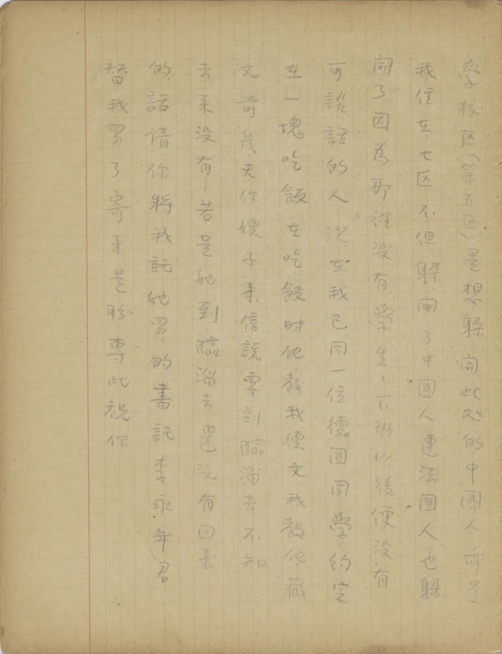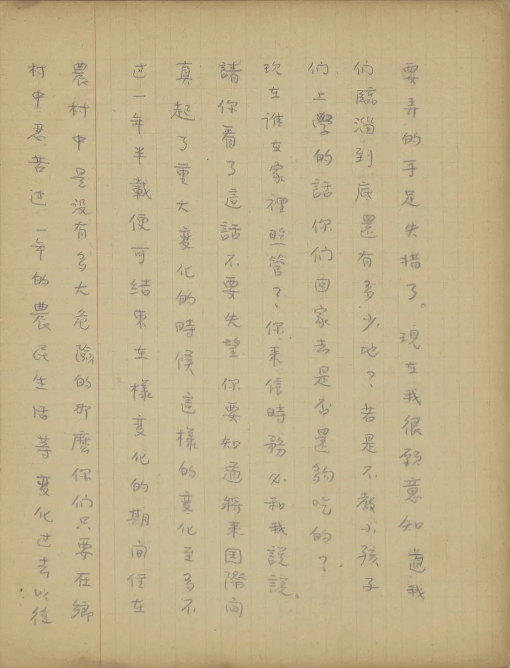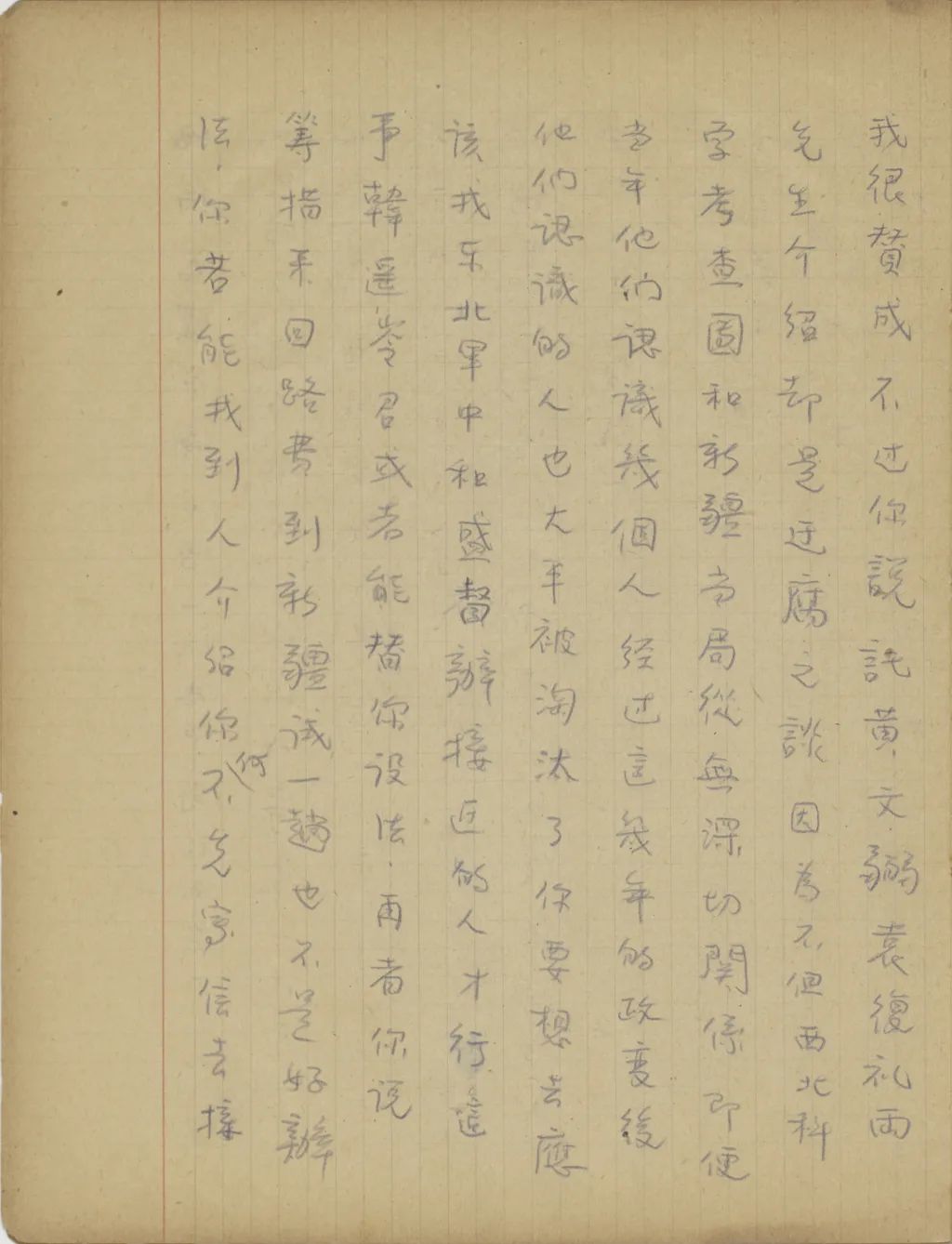 你同培新來的幾封信都收到了。我上一次給你寫信時,是因為這里報載遠東形式極為緊張,所以教你把東西收拾一下,作隨時能離開北平的準備。不過近來國內(nèi)形勢又有很大的變化,[中國?]已經(jīng)找不到安全的地方,所以你們只好先在北平住著,等不能住的時候再想辦法。從你的來信中,知道媽媽從祖父去世后心境很是不好,且是身子也常不壯實。我看了后,心中很覺不安,不過只要我們一天有飯吃,便不能教媽媽受罪。這事媽媽可以放心的。從來信中也知道,你們因為錢不夠用,已經(jīng)為趙媽和胡媽另想了別的辦法,現(xiàn)在媽媽為我們照料小孩子。我看了后,一方面因為我不能掙錢,使你和媽媽受累,心中很是難過,一方面見你能在困難中想法應付環(huán)境,心中很是感激。我上次信中教培新用心學英文,以后我設法使他到外國來讀書,這是我將來的打算。他來信說,希望能把全家?guī)У酵鈬鴣?,那卻不是容易的事。其實,這樣的夢想,我也不是沒有。我常想,若是我能在一兩年中暫時擺脫家庭的擔負,在這期間在國外活動一點事,為你們也找一點作事的機會,同時也為你們攢一點路費,一兩年后能把你們帶出來也未可知。不過這是沒有十分把握的事,不敢冒險這樣辦??墒菍懙竭@里,我覺得在國際形勢這樣緊張的時候,即便我不想擺脫家庭的擔負,你們也要自己預備一個退步。因為現(xiàn)在國際間不一定那[哪]一天便發(fā)生變故,等便[變]故發(fā)生以后,我在國外想法維持一人的生活是可能的,不過是否能趕回中國去卻不敢說,即便能趕回國去,我們不愿意在“友邦保護”之下吃飯的人是否有事可作更是問題。若是你們不早想一個退一步的辦法,那時便要弄的手足失措了?,F(xiàn)在我很愿意知道,我們臨淄到底還有多少地?若是不教小孩子們上學的話,你們回家去是否還夠吃的?現(xiàn)在誰在家里照管?你來信時務必和我說說。請你看了這話不要失望,你要知道將來國際間真起了重大變化的時候,這樣的變化至多不過一年半載便可結(jié)束。在〔這〕樣變化的期間住在農(nóng)村中是沒有多大危險的,那么你們只要在鄉(xiāng)村中忍苦過一年的農(nóng)民生活,等變化過去以后,中國便可走上復興之路,我們的前途也是光明的。祝你們平安。