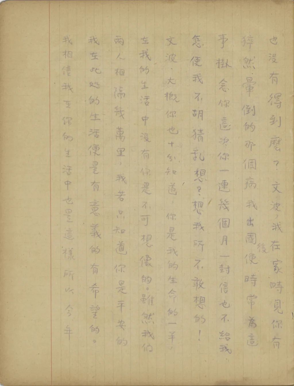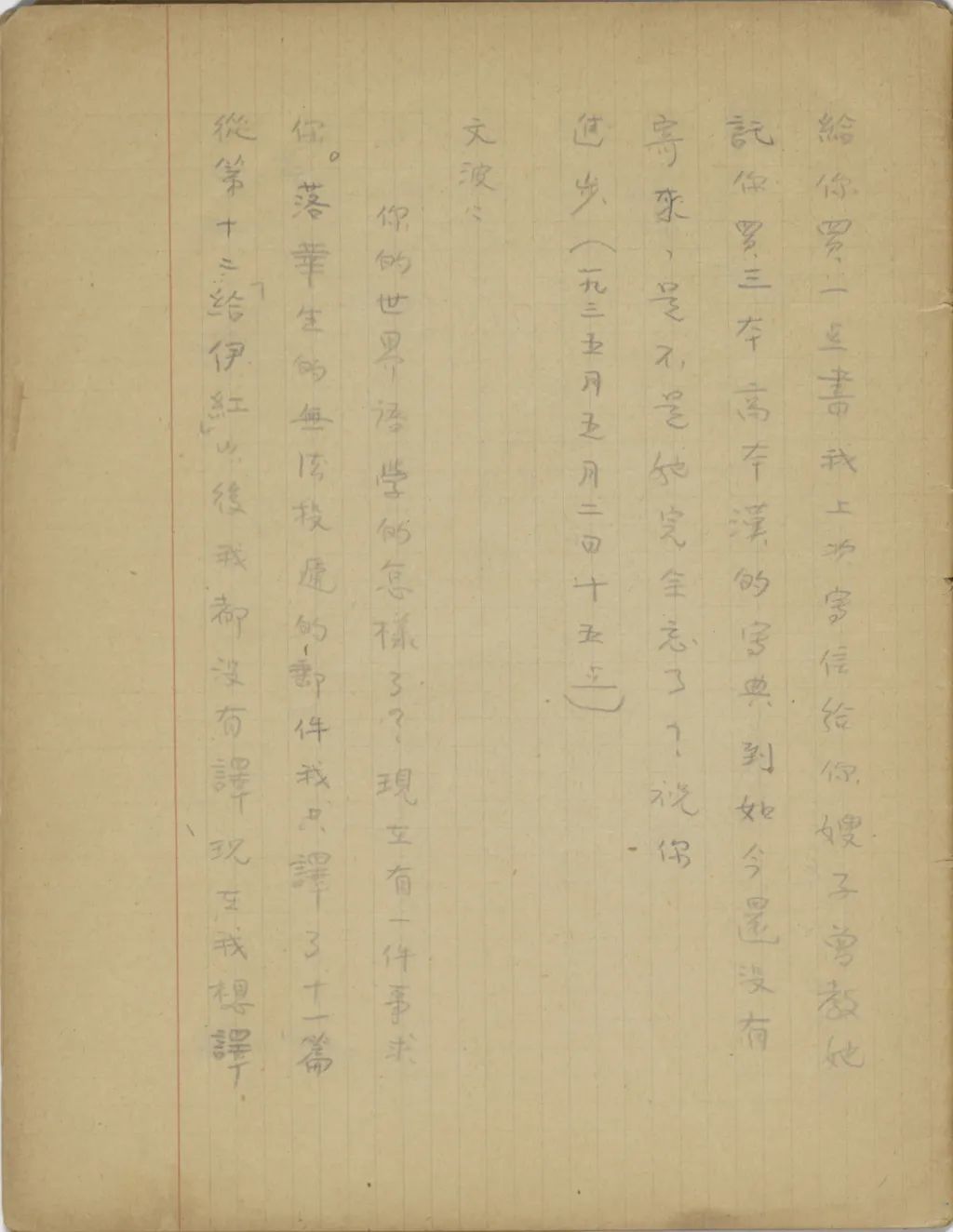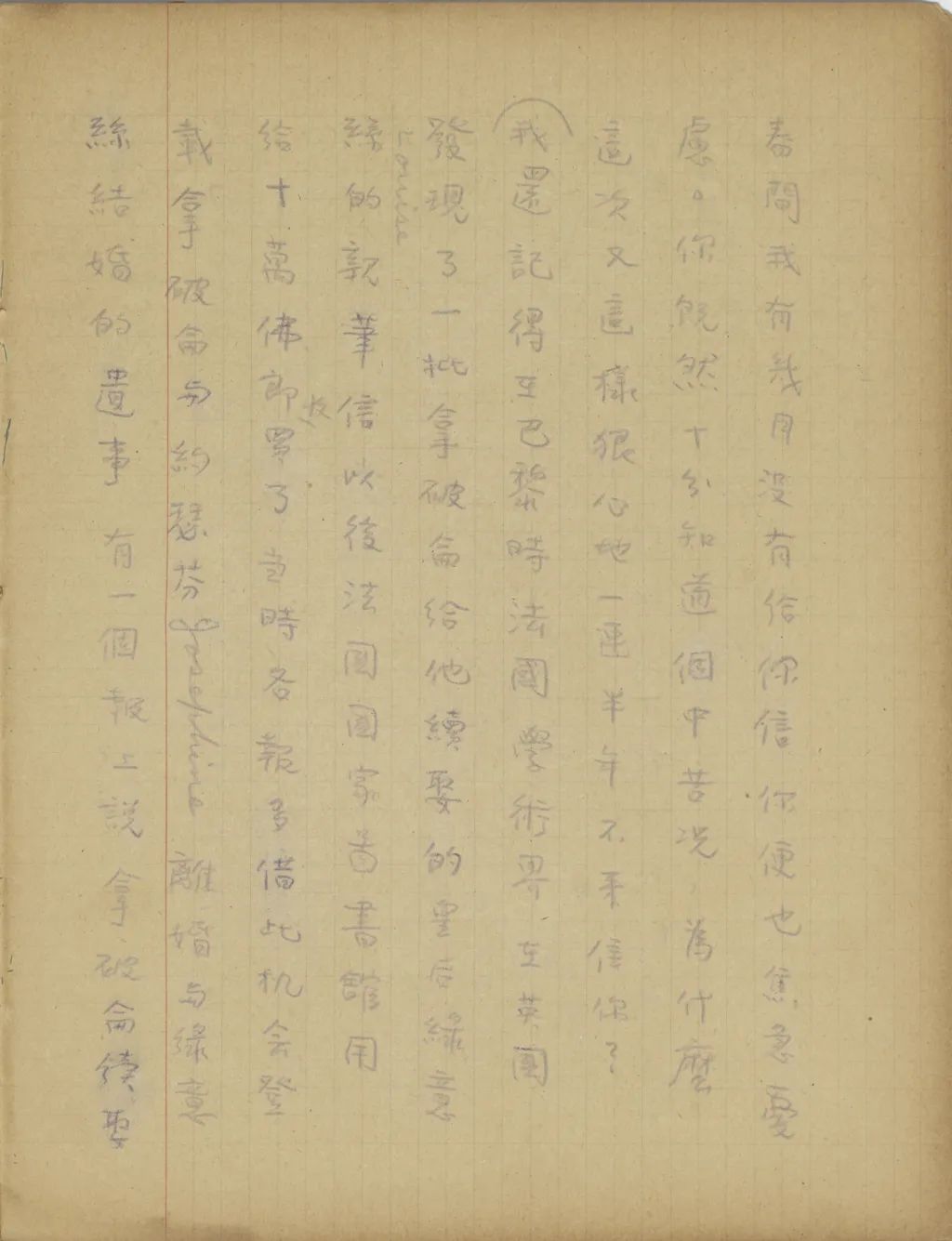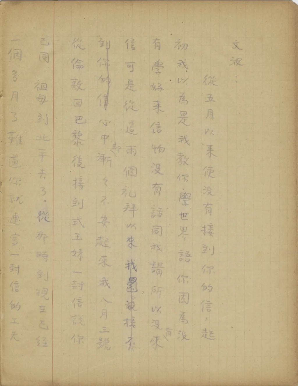 從五月以來便沒有接到你的信,起初我以為是我教你學世界語,你因為沒有學好,來信怕沒有話同我講,所以沒有來信??墒菑倪@兩個禮拜以來,心中卻漸漸不安起來。我八月三號從倫敦回巴黎后,接到式玉妹一封信,說你已同祖母到北平去了。從那時到現(xiàn)在,已經(jīng)一個多月了,難道你就連寫一封信的工夫也沒有得到么?文波,我在家時見你有猝然暈倒的那個病,我出國后便時常為這事掛念你,這次你一連幾個月一封信也不給我,怎使我不胡猜亂想?想我所不敢想的!文波,大概你也十分知道,你是我的生命的一半,在我的生活中沒有你是不可想象的。雖然我們兩人相隔幾萬里,我若只知道你是平安的,我在此處的生活便是有意義的,有希望的。我相信,我在你的生活中也是這樣。所以,今年春間,我有幾月沒有給你信,你便也焦急憂慮。你既然十分知道個中苦況,為什么這次又這樣狠心地一連半年不來信你[sic]?(我還記得在巴黎時,法國學術(shù)界在英國發(fā)現(xiàn)了一批拿破侖給他續(xù)娶的皇后綠意絲Louise的親筆信,以后法國國家圖書館用給十萬佛郎收買了。當時各報多借此機會登載拿破侖與約瑟芬Josephine離婚,與綠意絲結(jié)婚的遺事。有一個報上說,拿破侖續(xù)娶后,對綠意絲雖一時感情不惡,而拿破侖晚年在痛苦時,口中所叫的名字不是綠意絲,卻是約瑟芬。我當時看到這里,便放下報哭了好久,一面為拿破侖灑同情淚,一面卻也深自慶幸,我能和我惟一的知心人始終甘苦相共)文波,從昨天起,我已有點坐臥不安,每一想到我所不敢想的,便心中陣陣酸楚?,F(xiàn)在寫這封航空快信給你,你收到后若還可憐我的話,請立時給我封航空快信。祝你平安。
