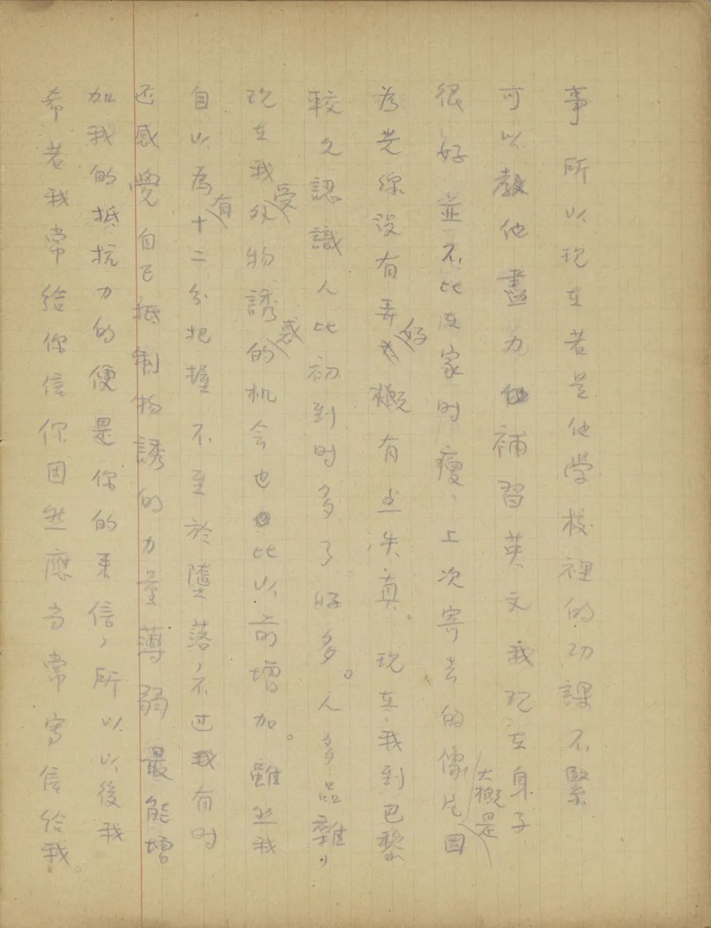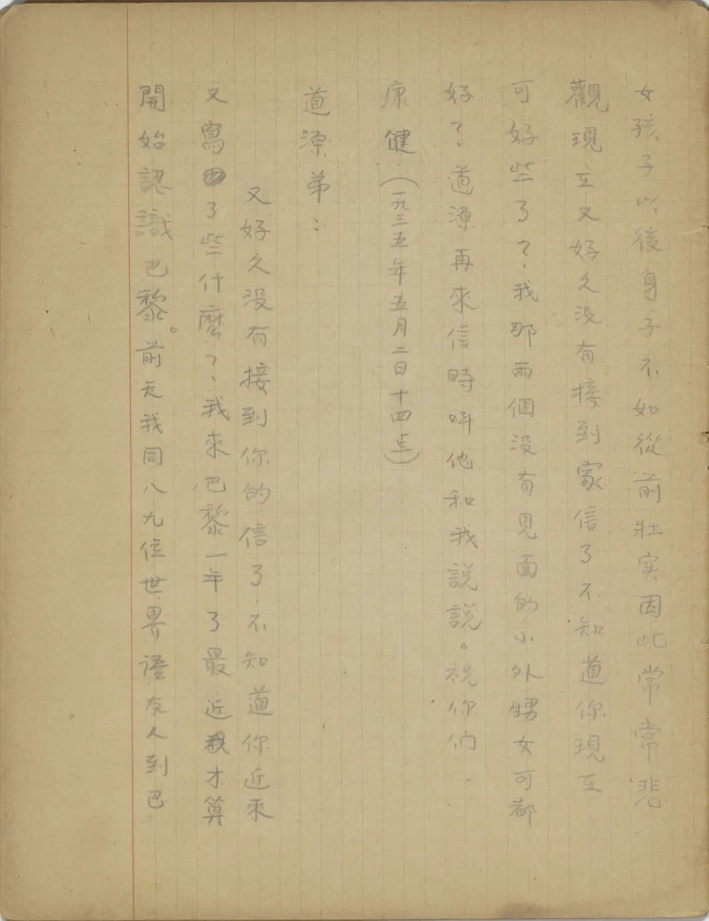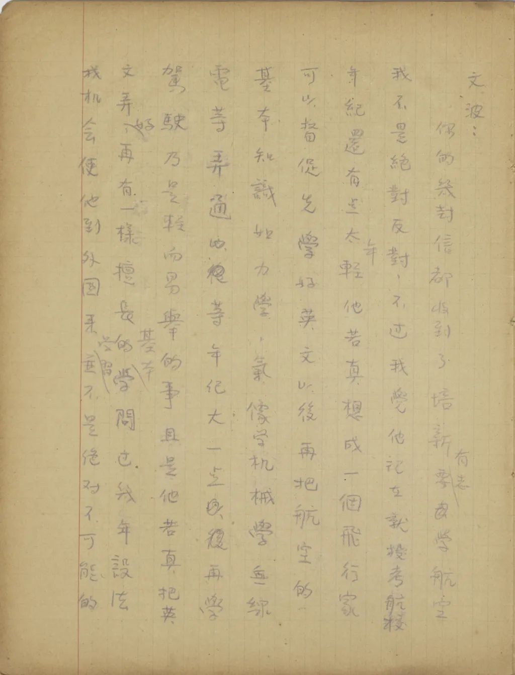 你的幾封信都收到了。培新有志要學航空,我不是絕對反對,不過我覺他現(xiàn)在就投考航校,年紀還有點太年輕。他若真想成一個飛行家,可以督促先學好英文,以后再把航空的基本知識如力學、氣象學、機械學、無線電等弄通,等年紀大一點,再學駕駛,乃是輕而易舉的事。且是他若真把英文弄好,再有一樣擅長的基本學問,過幾年設法找機會使他到外國來學習,并不是絕對不可能的事。所以,現(xiàn)在若是他學校里的功課不緊,可以教他盡力補習英文。我現(xiàn)在身子很好,并不比在家時瘦。上次寄去的像片大概是因為光線沒有弄好,有點失真?,F(xiàn)在我到巴黎較久,認識人比初到時多了好多。人多品雜,現(xiàn)在我受外物誘惑的機會也比以前增加。雖然我自以為有十二分把握不至于墮落,不過有時還感覺自己抵制物誘的力量薄弱,最能增加我的抵抗力的便是你的來信,所以以后我希[望?]若我常給你信,你固然應當常寫信給我,即便我不常寫信給你,你也應當常寫信給我。祝你平安。