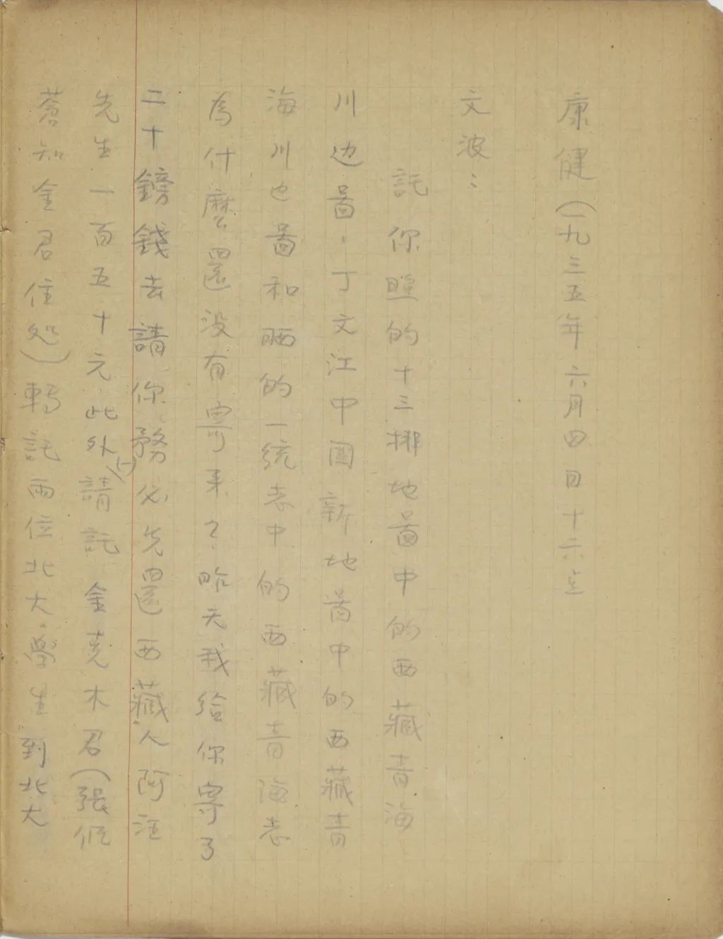 托你照的《十三排地圖》中的西藏青海川邊圖,丁文江《中國新地圖》中的西藏青海川邊圖,和曬的《一統(tǒng)志》中的《西藏青海志》,為什么還沒有寄來?昨天我給你寄了二十鎊錢去,請你務必先還西藏人阿汪先生一百五十元。此外,(一)請托金克木君(張佩蒼知金君住處)轉(zhuǎn)托兩位北大學生到北大講義科替我買兩部吳燕紹的《西藏史》。寄一部來,一部你留下,以后我要請人為它作索引。(二)到圖書館請王以中先生將輿圖部所有的沒有印過的西藏川邊青海圖都照一份寄來,這些圖照時不妨縮?。≈灰芸辞宄悖劬??]可以。(三)請到研究院再買二十五本《藏歌》,立時寄來,務必務必。培新等秋季學費,我當寫信給傅先生將研究所津貼留給你們。