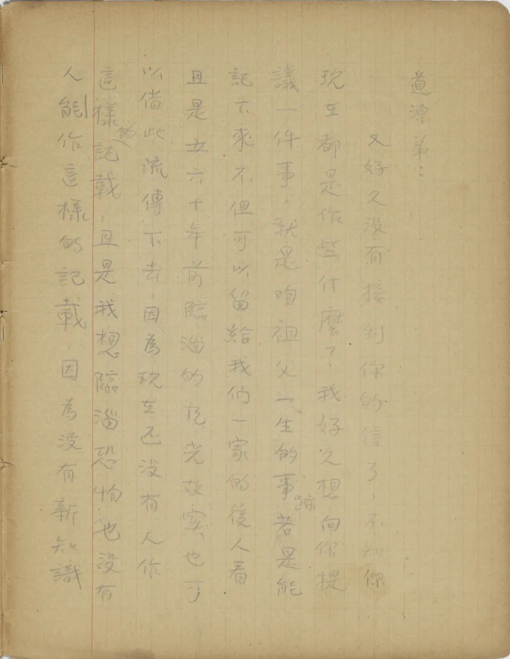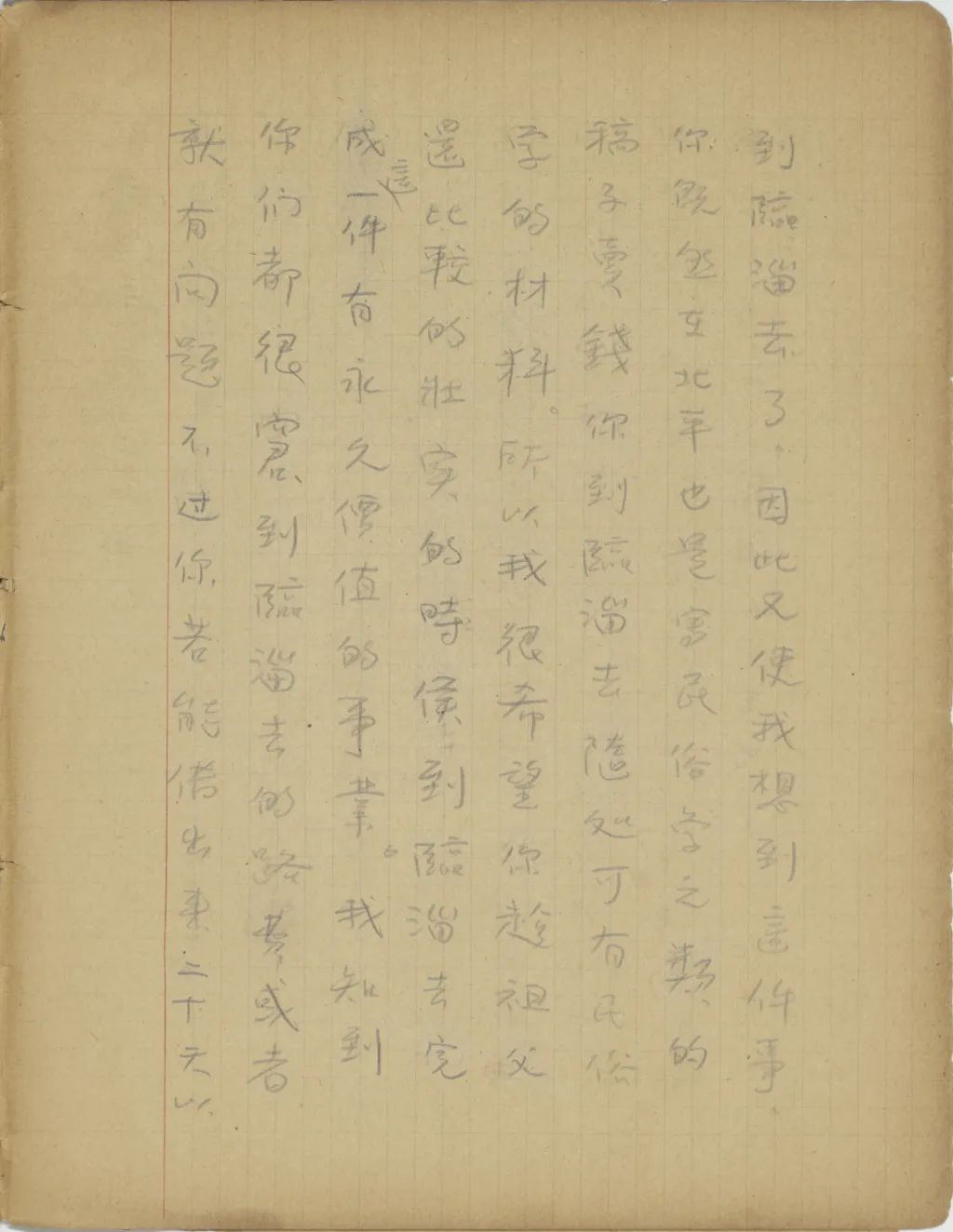又好久沒有接到你的信了,不知你現(xiàn)在都是作些什么?我好久想向你提議一件事,就是咱祖父一生的事跡,若是能記下來,不但可以留給我們一家的后人看,且是五六十年前臨淄的風光故實也可以借此流傳下去,因為現(xiàn)在還沒有人作這樣的記載,且是我想臨淄恐怕也沒有人能作這樣的記載,因為沒有新知識和新眼光的人一定棄精華而取糟粕。你既然對新舊兩方面的東西都看過不少,我想[相]信你若肯費幾個月的工夫,一定能寫出一本像樣的東西來。在中國農(nóng)村狀況急劇轉(zhuǎn)變的今日,再過幾年你這部書便成了很可寶貴的史料了。前天接到你嫂子的信,說祖父近來不大壯實,很想小孩子們。她已于五月五日到臨淄去了,因此又使我想到這件事。你既然在北平也是寫民俗學之類的稿子賣錢,你到臨淄去隨處可有民俗學的材料。所以我很希望你趁祖父還比較的壯實的時候,到臨淄去完成這一件有永久價值的事業(yè)。我知到[道]你們都很窘,到臨淄去的路費或者就有問題,不過你若能借出來二十天,以后我的款到手后,我便給寄去。祝你進步。(一九三五年五月十七日十點半)