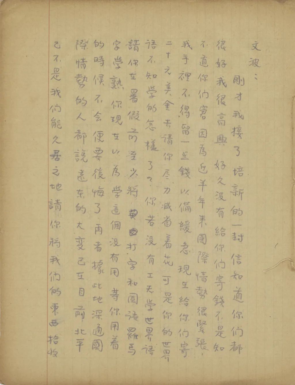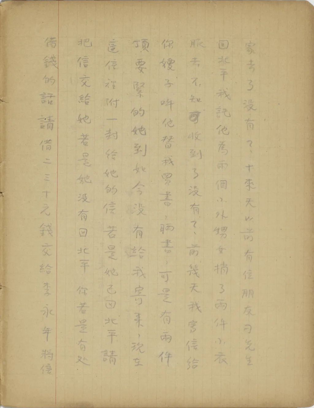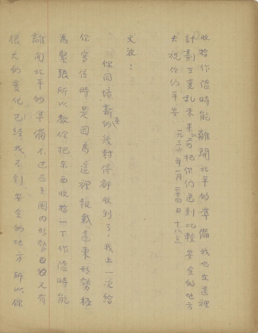 剛才我接了培新的一封信,知道你們都很好,我很高興。好久沒有給你們寄錢,不是知不道你們窘,因為近半年來國際情勢很緊張,我手里不得留一點錢以備緩急。現(xiàn)在給你們寄二十元美金去,請你盡力減省著花。可是你的世界語不知學的怎樣了?你若沒有工夫?qū)W世界語,請你在暑假前至少將打字和國語羅馬字學熟。你現(xiàn)在以為學這個沒有用,等你用著的時候不會,便要后悔了。再者,據(jù)此地深通國際情勢的人都說,遠東的大變已在目前,北平已不是我們能久居之地,請你將我們的東西拾收[收拾]收拾,作隨時能離開北平的準備。我也在這里計劃,在變亂未來以前,把你們送到比較安全的地方去。祝你們平安。