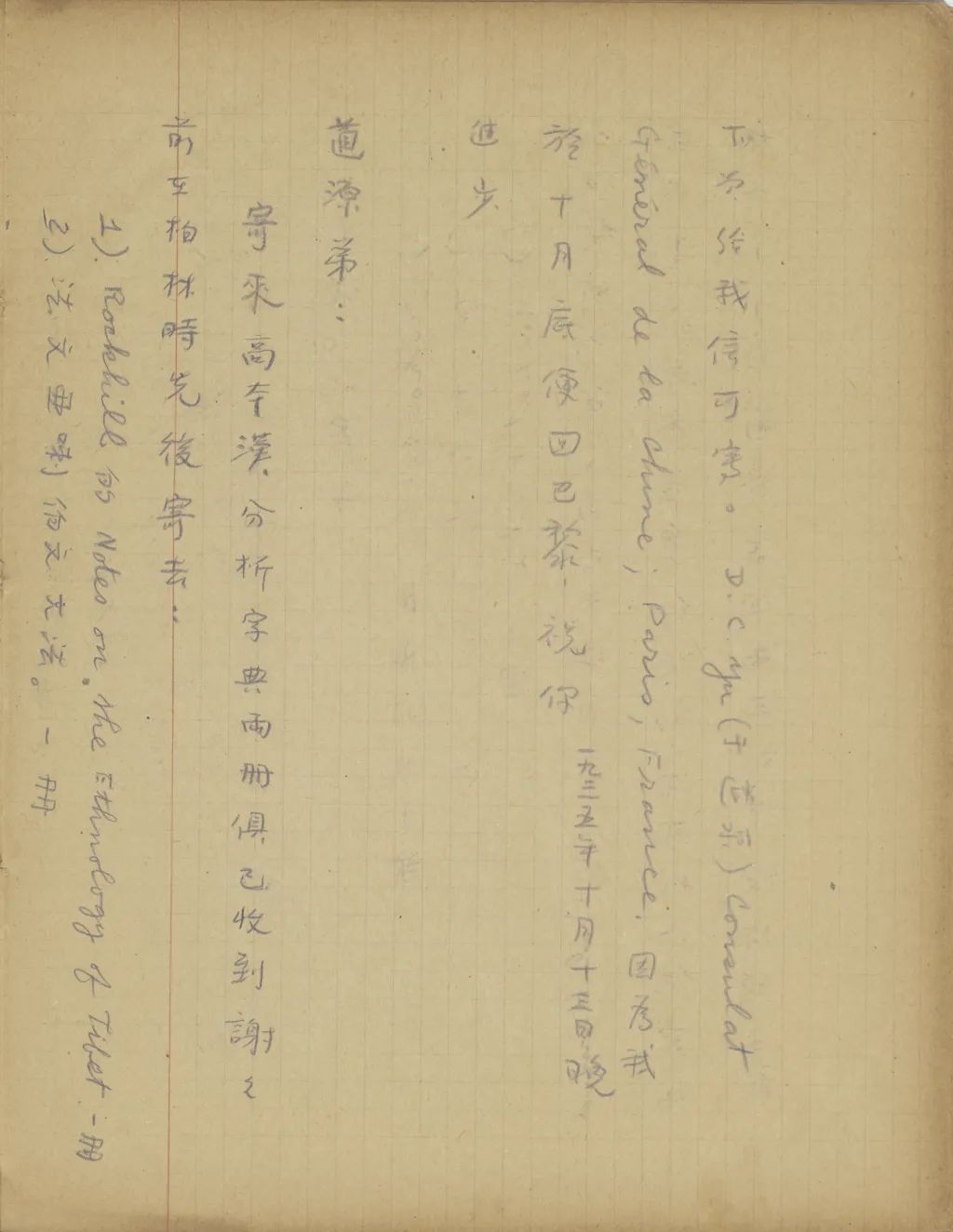 昨天我寄了一封掛號信和三十鎊英金去,你或者還沒有收到罷?收到后請將十鎊(約可換一百三十元)交給道源,二十鎊交給你嫂子,請他[她]替我還債和買書。前幾天我寫信叫道源到臨淄去,不知道他去了沒有?我有好幾個月沒有接到道源的信了,也不知道為什么。我現(xiàn)在搬了家了,我從前不愿意住在巴黎學校區(qū)(第五區(qū)),是想躲開此處的中國人,可是我住在七區(qū),不但躲開了中國人,連法國人也躲開了。因為那里沒有學生,下班以后便沒有可談話的人?,F(xiàn)在我已同一位德國同學約定在一塊吃飯,在吃飯時他教我德文,我教他藏文。前幾天你嫂子來信說要到臨淄去,不知去來沒有,若是她到臨淄去還沒有回來的話,請你將我托她買的書托李永年君替我買了寄來是盼。專此,祝你康健。(一九三五年六月四日十六點)