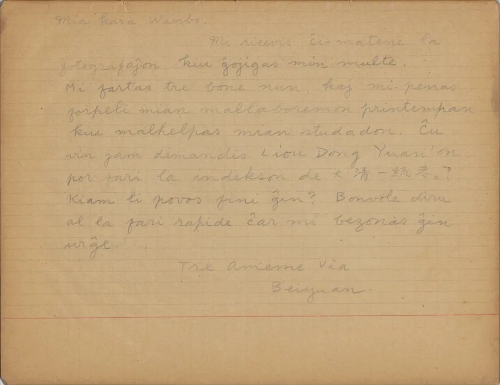 此信為于道泉用世界語寫給于太太顧文波的一封信,疑為第一封信中提到的“現(xiàn)在考一考你,請你將這片紙上的文字譯出寄來”的“這片紙上的文字”。