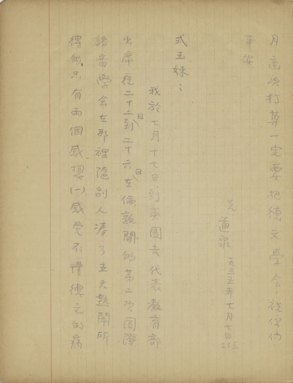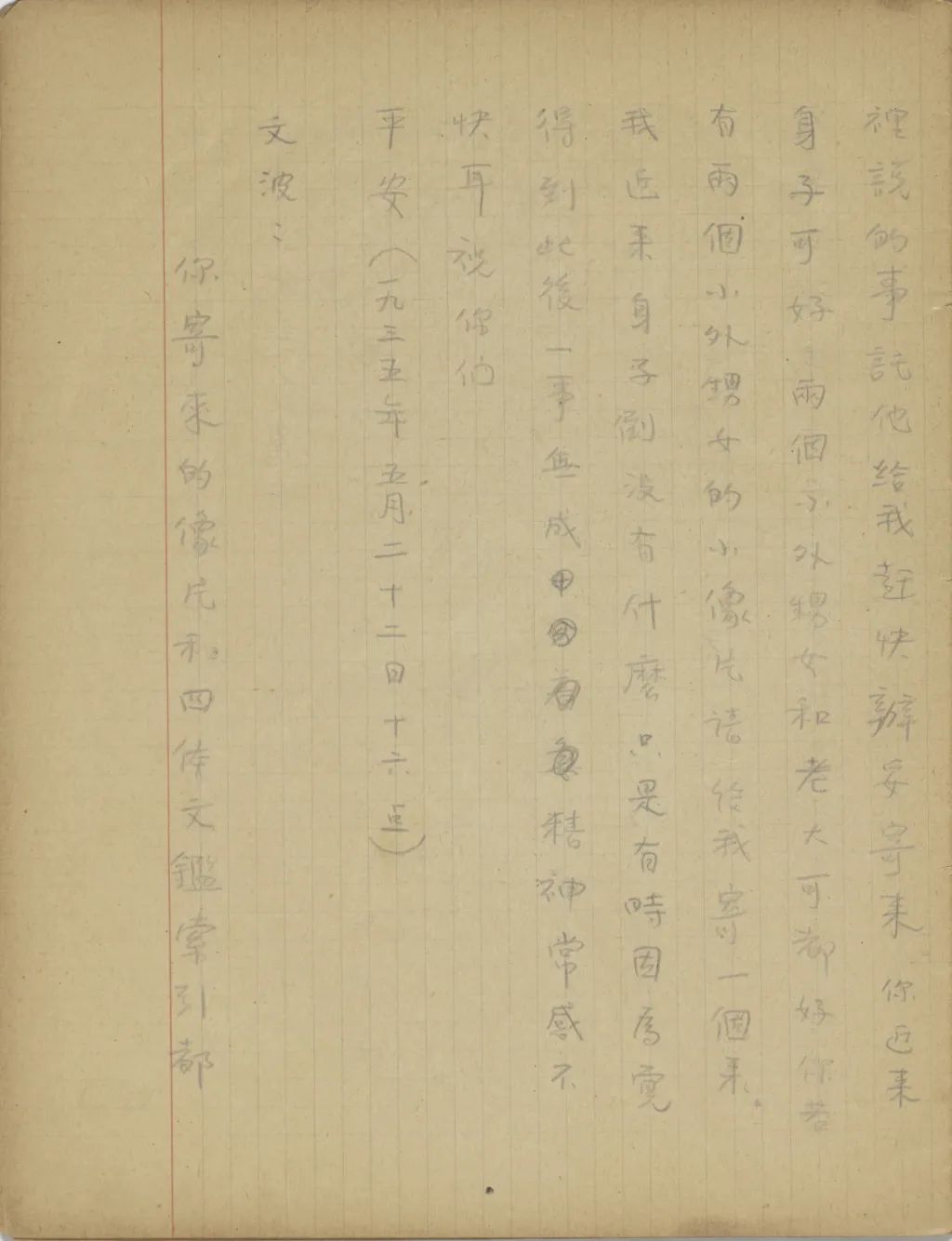 有工夫時,請抱著兩個小東西,照個像片給我寄來,因為我已忘了培筠子是什么樣了。祝你你[們]平安。(一九三五年四月十五日十三點)